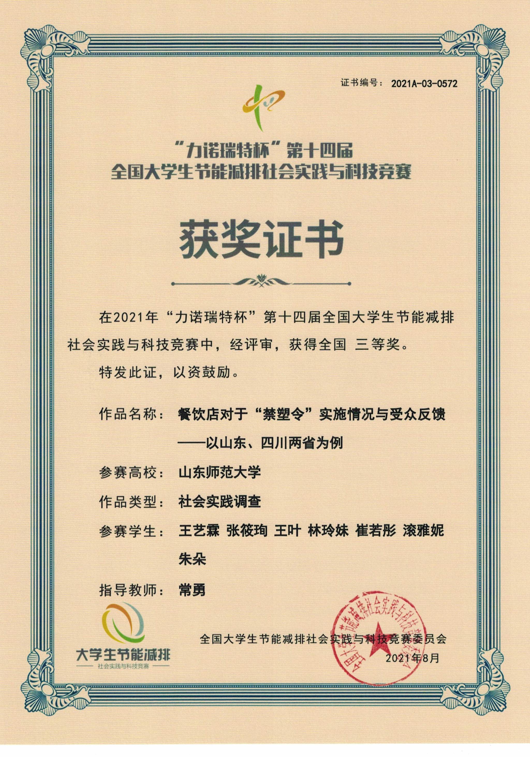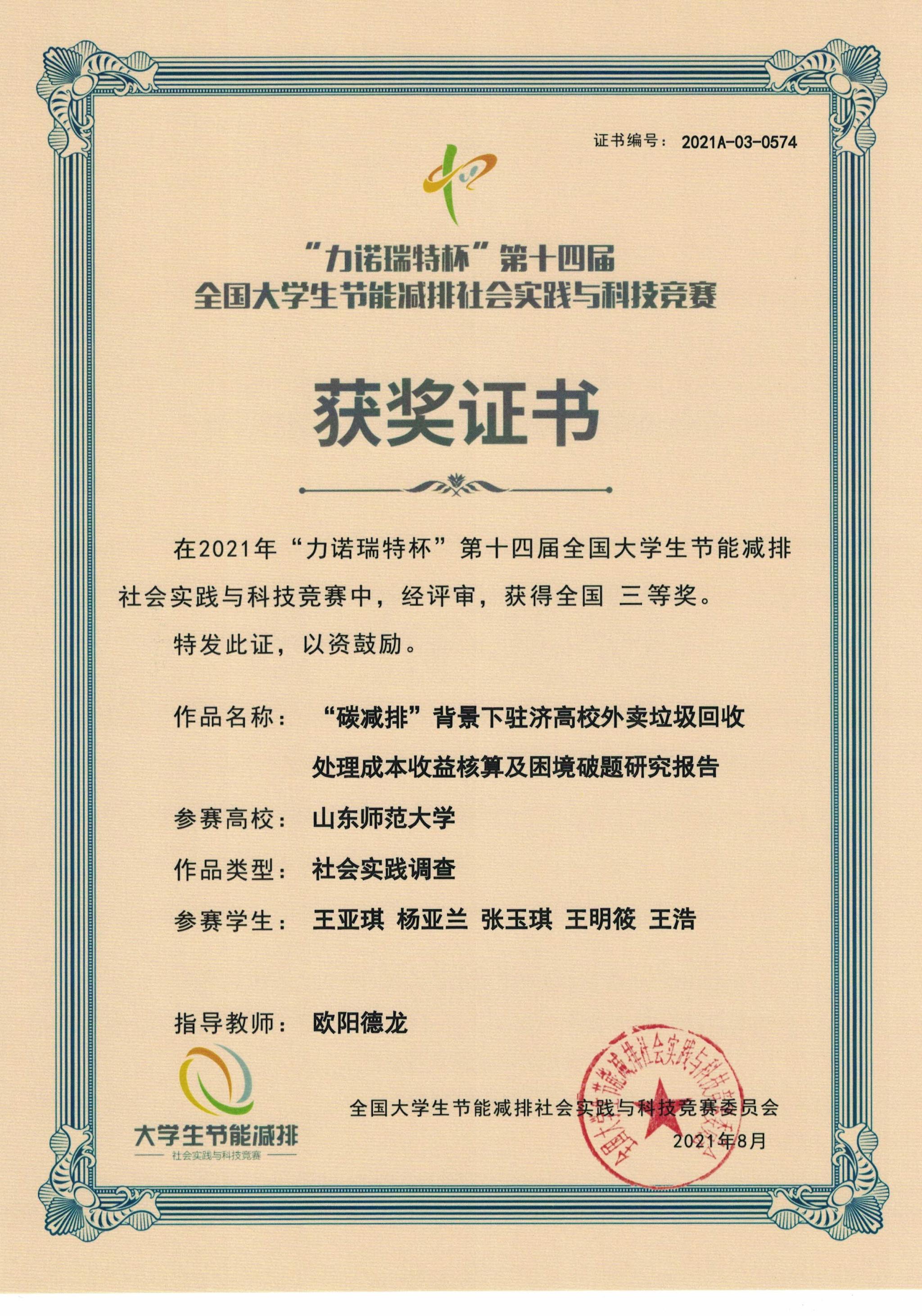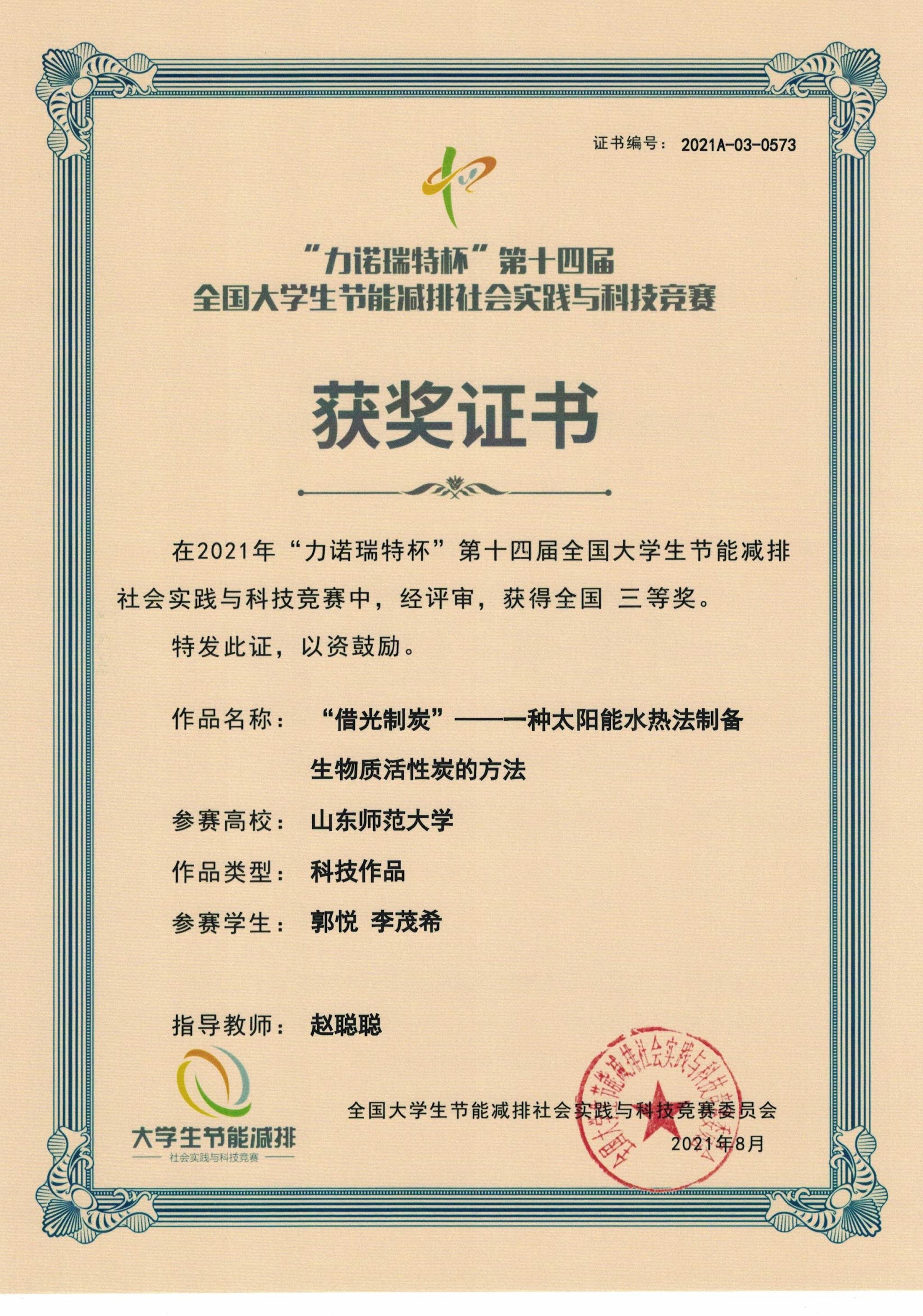 我校自1月份启动校内选拔赛,在学校教务处和我院(节能减排社会实践与科技竞赛中心挂靠单位)广泛宣传发动下,来自生命科学学院、国际教育学院、经济学院等9个学院的近200名同学参加了此次比赛。通过网络评审和现场答辩评审,评审专家对参赛作品的科学性、创新性、技术水平及应用推广等指标进行综合评判,评选出一、二、三等奖,其中共有15支队伍脱颖而出,入围国赛。最终我院提交的《餐饮店对于“禁塑令”实施情况与受众反馈——以山东、四川两省为例》、《“借光制碳”——一种太阳能水热法制备生物质活性炭的方法》、《“碳减排”背景下驻济高校外卖垃圾回收处理成本收益核算及困境破题研究报告》3个项目荣获全国三等奖,我校荣获“优秀组织奖”。