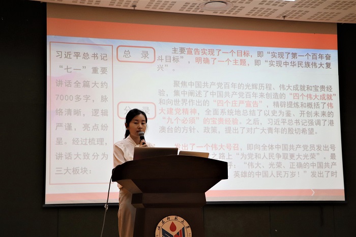宣讲人黄彩虹博士以习近平总书记的“七一”重要讲话为主线,紧紧围绕“全面建成小康社会重要宣告、百年不懈奋斗创造的伟大成就、伟大建党精神作为源泉力量、“九个必须”基本方略” 四个部分内容,深刻阐述了习近平总书记“七一”重要讲话的重大意义、主要内容和丰富内涵,深入解读了在新征程上以史为鉴、开创未来的根本要求。她号召全体青年要以实现中华民族伟大复兴为己任,增强做中国人的志气、骨气、底气,不负时代,不负韶华,不负党和人民的殷切期望。