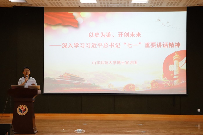 为进一步发扬红色传统,传承红色基因,深入学习贯彻习近平总书记“七一”重要讲话精神。9月16日下午,山东师范大学图书馆报告厅举办党史学习教育博士宣讲团主题宣讲活动,此次活动由校党委研究生工作部举办,地理与环境学院承办,地理与环境学院、图书馆和环境生态研究院的全体学生党员、入党积极分子和2021级新生参加活动。本次活动由地理与环境学院党委副书记李山峰主持。