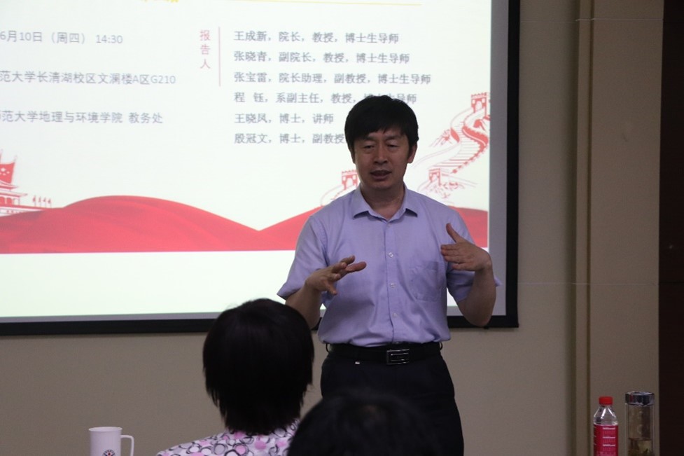 为将思想政治教育贯穿人才培养体系,全面推进课程思政建设,发挥好专业课程的育人作用,教务处联合地理与环境学院于6月10日在文澜楼A区G210开展了“学为人师,行为世范”课程思政系列讲座第三期——地理与环境学院课程思政建设交流会。会议由地理与环境学院党委书记钟秀芳主持,邀请了王成新、张晓青、张宝雷、程钰、王晓凤、殷冠文6位老师做交流报告,学院教师出席会议。
