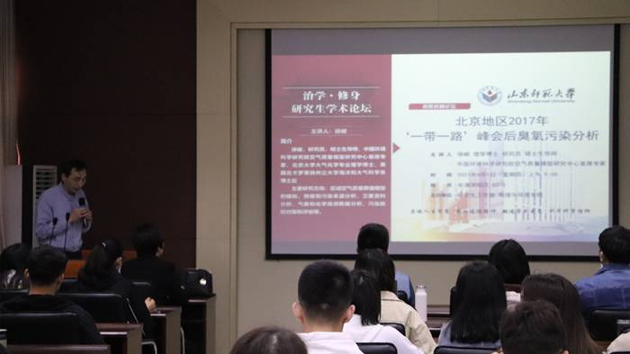 4月1日,地理与环境学院邀请中国环境科学研究院研究员徐峻在文澜楼G210报告厅作学术报告,报告题为“北京地区2017年‘一带一路’峰会后臭氧污染分析”。学院教师刘厚凤、史祥利、许鹏举和近百名研究生参加会议。