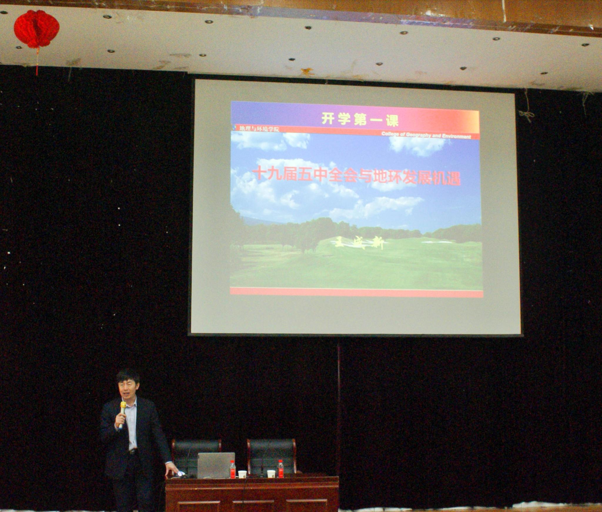 王成新以“十九届五中全会与地环发展机遇”为题,通过引用习近平总书记在多地考察工作中的寄语,引出对《中共中央关于制定国民经济和社会发展第十四个五年规划和二〇三五年远景目标的建议》的深入解读和阐述。他以世界几个典型国家的发展规划及时空演变规律,针对性讲解了我国新时代发展规划的历史必然性。他指出“地理之道,见人所未见”,他结合打造“平安中国”、推进“一带一路”倡议、构建“人与生态环境命运共同体”为例,阐述了十九届五中全会精神中有关论述为地理学、环境科学等相关学科带来的新机遇。他呼吁学院青年学子们要学好专业知识、把握时代机遇、投身强国伟业,将自己之所学,青春之理想融入到党和国家事业之中。