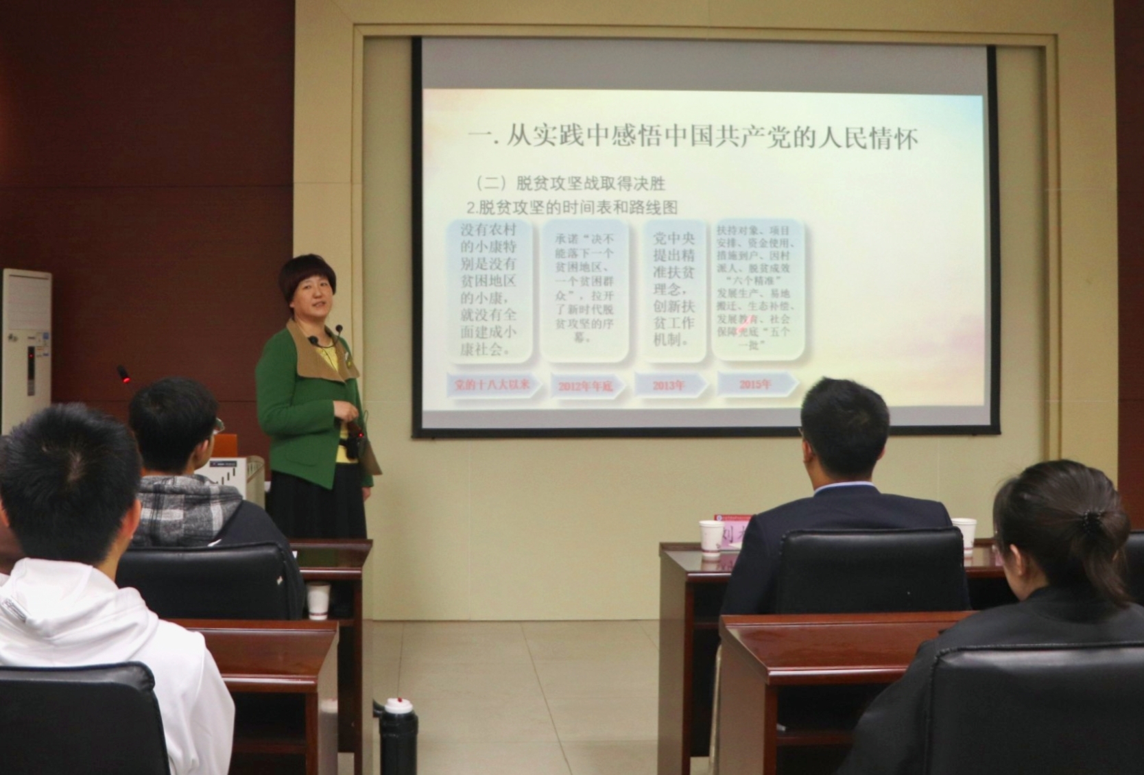 钟秀芳以“感悟中国共产党的人民情怀”为题,以党的历史为主线,从“新冠疫情防控”、“脱贫攻坚决战决胜”、“实现乡村振兴,实现共同富裕”三个方面展开具体论述,她结合自身十余年基层工作经历,将中国国家治理体系和治理能力的思维智慧、制度智慧、政策智慧以具体实例进行了深入讲解,让同学们在感受到中国共产党对人民深厚情感的同时,体会到我国政治制度的优越性。钟秀芳提到,在新时代的征途上,只要我们坚持党的领导,始终坚持人民利益高于一切、坚持依靠人民,就能赢得人民的支持,永远立于不败之地。