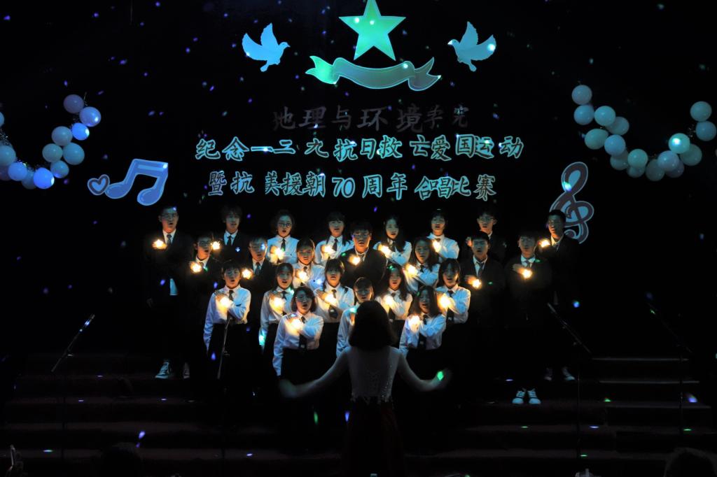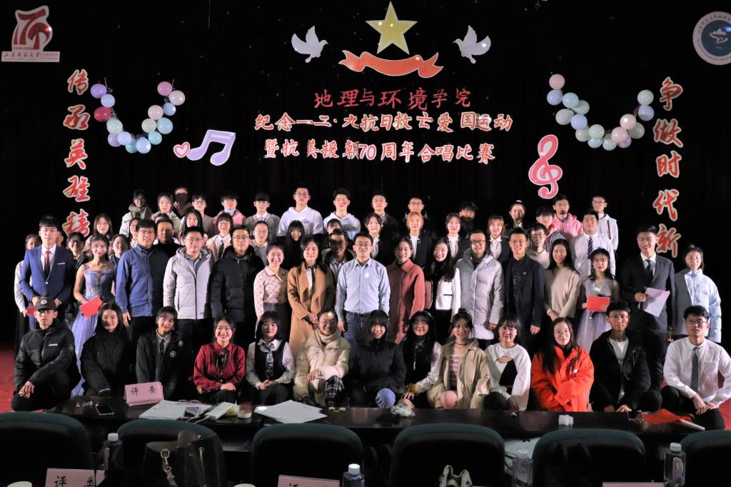 为致敬“一二·九抗日救亡运动”85周年、中国志愿军赴朝作战70周年,让广大青年学子在“沉浸式”的文化氛围中,接受爱国主义、革命英雄主义熏陶,12月6日晚,我院于长清湖校区第三报告厅举办“传承英雄精神·争做时代新人——纪念‘一二·九’抗日救亡爱国运动暨抗美援朝七十周年”班级合唱比赛。本次比赛邀请到心理学院段廷正、刘梦,公共管理学院孙冰,经济学院朱灏,商学院孙梦瑶五位辅导员担任评委。学院党委副书记李山峰,团委书记、学工办主任李妮娜,地理科学系教师刘凯、环境科学系教师隋潇,学院辅导员陈光、刘莎、刘相良、欧阳德龙、唐永超共同出席了本次活动。2019级、2020级全体同学以及研究生代表参加了本次比赛。