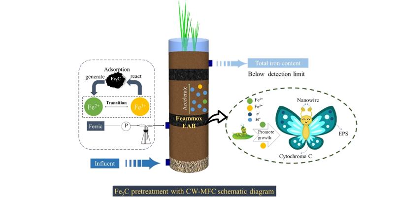 人工湿地型微生物燃料电池(Constructed wetland microbial fuel cell, CW-MFC)是基于人工湿地底部厌氧、表面好氧的结构特性耦合微生物燃料电池、以微生物为催化剂将污水中的生物质能转化为电能的装置,具有环境友好的特点。目前钢铁行业产生具有产含铁废水量大、碳化铁废渣量多的特点,铁参与生物新陈代谢且二价铁、三价铁价态转换在电子传输方面发挥着重大作用。人工湿地微生物燃料电池处理含铁废水具有良好前景,基于此,应用碳化铁前处理含铁废水产生二价铁、三价铁后通入到人工湿地型微生物燃料电池中,通过观察水质净化情况、产电量、微生物群落功能三个指标,与未前处理的含铁废水以及微污染的河水相比装置的性能差异。结果表明,前处理含铁废水提高装置中二价及三价铁的含量从而促进装置微生物(Feammox, NOB)的功能最终促进装置产电和净化能力。