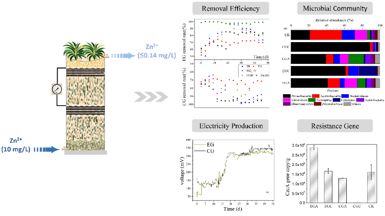 人工湿地-微生物燃料电池(CW-MFC)是一项环境友好型污水处理和生物质能源利用技术,在处理工业金属废水方面具有广阔的研究和应用前景,国内外对CW-MFC处理含锌废水的研究较少,锌对CW-MFC装置造成的影响也尚不明确。该研究工作为解决这一课题,应用上流式人工湿地耦合微生物燃料电池技术,成功构建了一套含锌废水的生态处理装置,通过观察水质净化情况、产电量、微生物群落功能三个指标,系统比对了该装置处理含锌工业废水及普通废水的差异。研究发现,含锌废水显著抑制了CW-MFC的水质净化能力和产电能力,这主要是由于工业废水中的锌抑制了CW-MFC中某些细菌功能属(主要是EAB, DNB, NOB 和 DNPAO)的丰度和装置阳极的微生物丰富度所造成的。CW-MFC对工业废水中的锌具有98.56±1.01%的去除效率,这是因为锌促进了CW-MFC中抗性基因CzcA的表达,使得CW-MFC中的微生物种群提高了对锌的耐受能力。