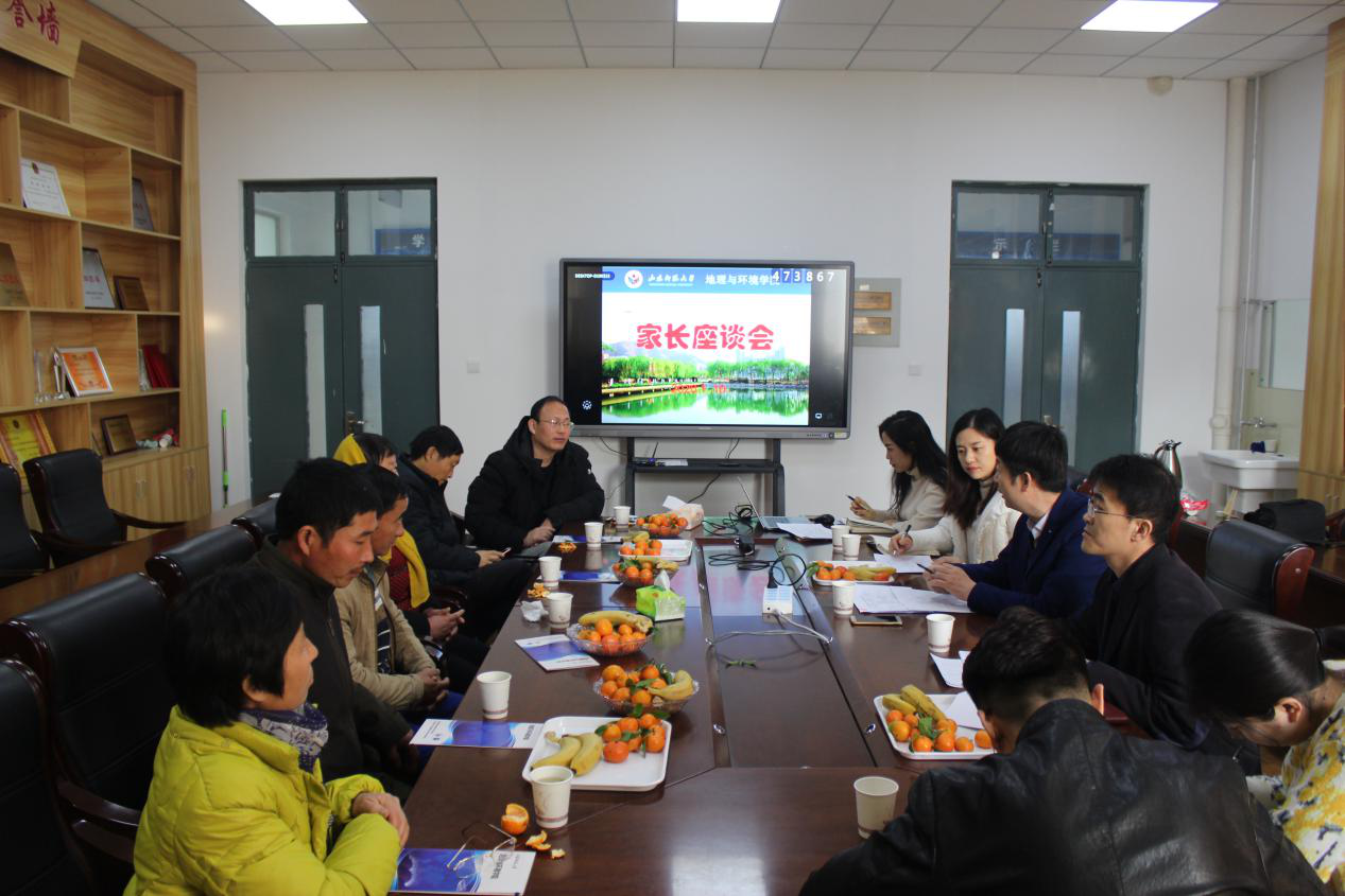 座谈会上,王成新首先代表学院对远道而来的学生家长表达了欢迎和感谢,他指出学生是一个家庭的希望,能通过努力考到山东师范大学进行高等教育的同学,都是勤勉努力的新时代好青年,地理与环境学院作为他们的培养单位,有必要更有实力,帮助他们完成人生理想,顺利成长成才。随后,他代表学院做出四点表态:一是学院保持竭尽全力地对同学们进行全方位的关注;二是学院定会不遗余力地为同学们的成长创造一切必要条件;三是学院继续坚定不移地贯彻服务奉献理念;四是学院将会进一步搭建畅通的家校交流的渠道。李山峰向家长们介绍了学院的学生工作情况,他从学风建设、日常管理、科创竞赛、社会实践、升学就业等方面的成绩与学生家长们进行了细致的阐述。随后,各年级辅导员也依次介绍了学生在校表现情况,并细心听取了家长们的建议和心声。座谈会最后,学院领导为各位家长送上了慰问金,并向各家庭送上了美好的新春祝福。