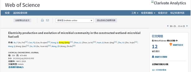 根据基本科学指标(Essential Science Indicators,简称ESI)2019年1月18日更新数据显示(数据统计覆盖时间为2008年1月1日-2018年10月31日),地理与环境学院为第一作者和通讯作者单位,徐飞副教授为第一作者,孔强教授为通讯作者撰写的《Electricity production and evolution of microbial community in the constructed wetland-microbial fuel cell》入选全球“工程学”领域Top 1% ESI高被引论文(Top 1% highly cited papers in the last 10 years)。该论文自2018年5月在《CHEMICAL ENGINEERING JOURNAL》(目前该期刊影响因子为6.735)上发表至今,被引用次数12次,在ESI工程学领域产生了积极的影响。