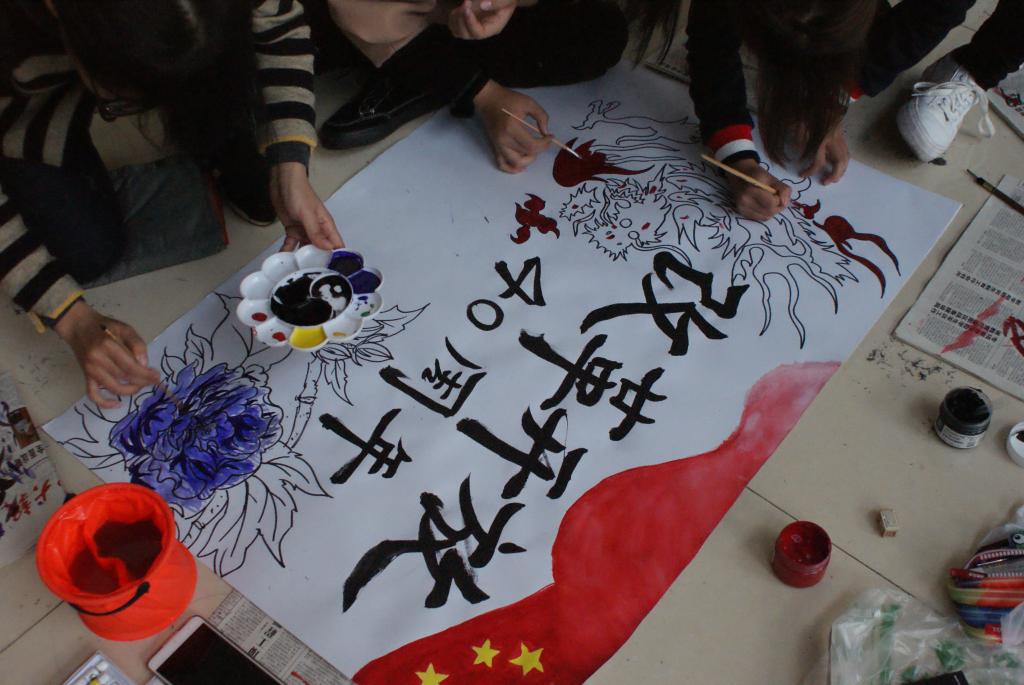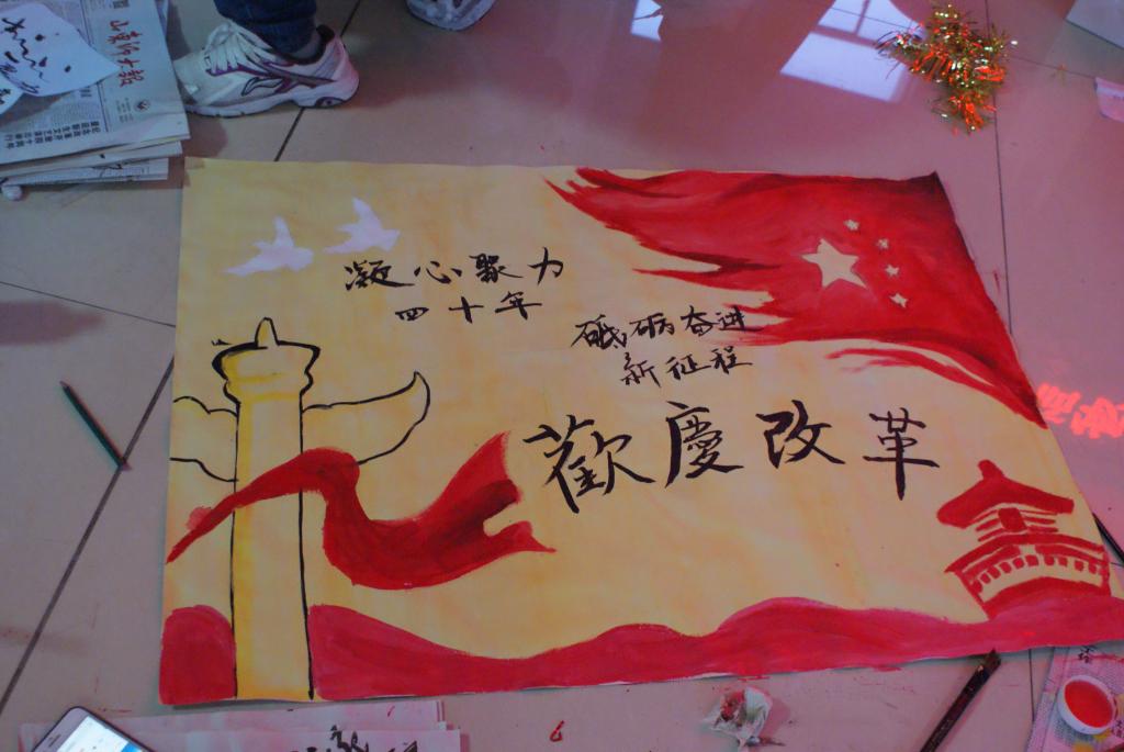 本次活动以小组赛的形式进行开展,选手们围绕“庆祝改革开放四十周年”的主题进行现场作画写字。大赛一开始,参赛选手们便斗志昂扬,纷纷大展身手,比赛现场气氛热烈。选手们娴熟运用毛笔、彩铅等工具,有的描绘出和平鸽展翅高飞的图景,有的刻画出牡丹花国色天香的美好,还有的表现出复兴号驰骋万里的宏伟,都充分展示了现代中国的繁荣与昌盛。其中,地理类1804班代表队以邓小平同志为主体,以天安门为背景,描绘出一对穿红衣的男女放飞和平鸽的温馨场景,既表达了对邓小平同志的敬仰,又展露着对和平的希望。活动逐渐接近尾声,在大家的认真努力与团结协作下,一幅幅作品成功跃然于纸上。