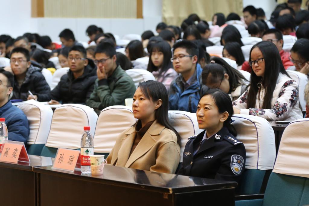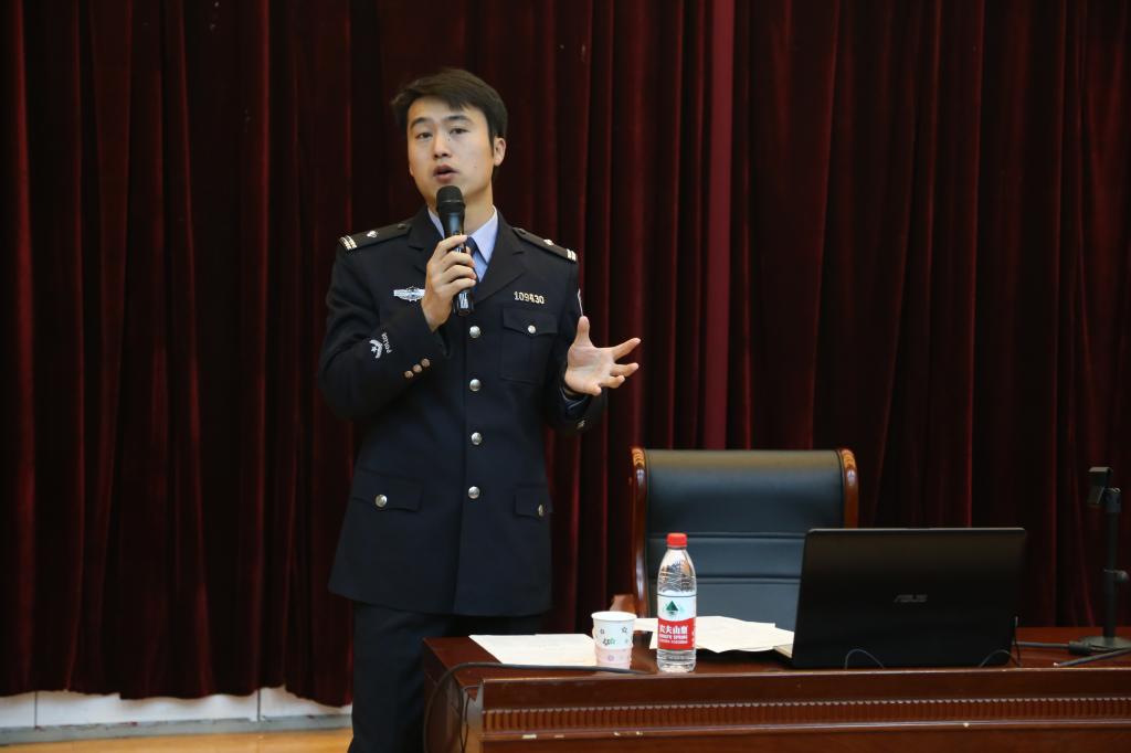 晚上六点半,讲座正式开始。首先,徐飞向大家介绍了到场的嘉宾并指出安全防范教育对于大学生的重要性。接着,崔凯从经济诈骗、盗窃案件、打架案件、生活常识等四个方面展开详细阐述。通过列举各高校盗窃案例、播放警方调查视频等形式说明了大学生对于诈骗事件辨别能力差、防盗能力差的现状。在讲解如何防范偷盗分子时,崔凯采取现场演示的方式,邀请同学们上台配合,通过典型盗窃案件再现的方式,使大家更真切地领悟各项防范技能,赢得了全场热烈的掌声。随后,进入现场提问环节,同学们积极举手发言,根据自身经历提出自己在安全防范方面的疑惑,崔凯都耐心地为其解答并给出建议。最后,徐飞补充讲解了自己亲身经历的诈骗和盗窃案件,并对整场讲座做出总结,至此,本次安全防范教育讲座圆满结束。