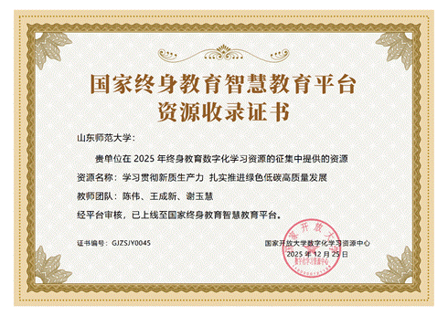 为深入贯彻国家教育数字化战略行动部署,全面落实《教育强国建设规划纲要(2024—2035 年)》工作要求,加快推进泛在可及的终身教育体系建设,服务学习型社会建设,根据教育部继续教育数字化资源征集工作的有关要求,山东省教育厅发布《关于征集终身教育数字化学习资源的通知》。在此背景下,我院陈伟、王成新等教师组成的课程建设团队,紧密围绕国家重大战略需求,精心打造的数字化学习资源课程《学习贯彻新质生产力 扎实推进绿色低碳高质量发展》成功入选,并正式上线“国家终身教育智慧教育平台”,充分彰显了我院在服务国家战略、推进教育数字化方面的积极成效。