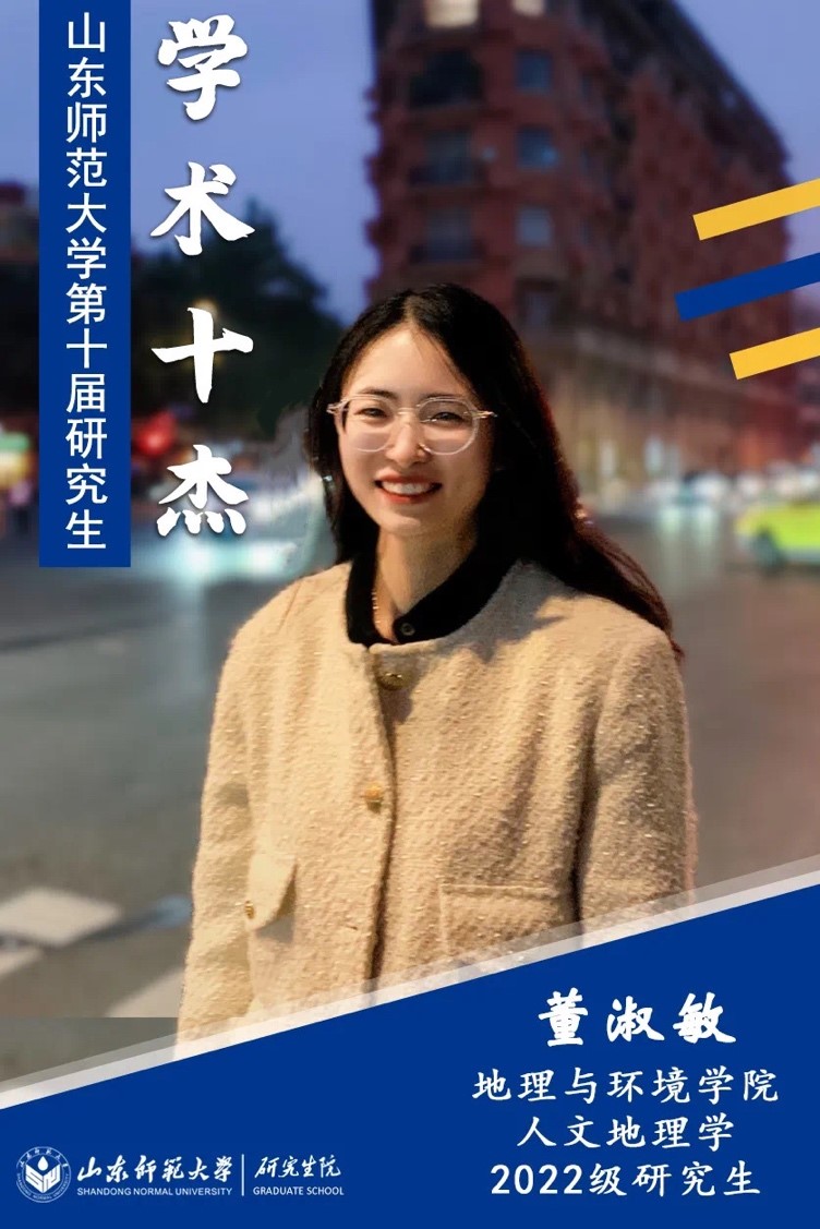董淑敏,女,地理与环境学院2022级人文地理学专业硕士研究生,中共党员,师从刘凯教授。现担任学院研究生第二党支部书记,曾担任学院研究生会执行主席。攻读硕士学位期间,以第一作者身份发表论文7篇,其中SCI一区top期刊1篇(Sustainable Cities and Society,IF=11.7)、SCI二区2篇、SSCI二区1篇、SCI三区1篇、中文核心1篇、省级刊物1篇,以第二作者身份(导师一作)发表SCI二区1篇、SSCI二区1篇。曾获第三届中国研究生“双碳”创新与创意大赛二等奖、第十六届山东省大学生科技节—山东省大学生地理创新大赛等比赛三等奖等奖项;第四批山东省哲学社会科学青年人才团队、2024年国家奖学金、优秀研究生、优秀研究生干部、优秀共青团员、“星翔计划”科研领军人物等荣誉。