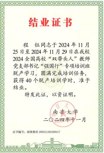 近日,由全国高校“双带头人”教师党支部书记“强国行”专项行动办公室主办、全国干部教育培训基地(南京大学)承办的2024年全国高校“双带头人”教师党支部书记“强国行”专项培训班顺利开班。南京大学党委副书记陈云松,南京大学党委常委、党委组织部、统战部部长、全国高校“双带头人”强国行专项行动办主任焦瑞华出席开班仪式。开班式由全国干部教育培训基地领导小组办公室主任、南京大学终身教育学院院长韩顺平主持。我院教工第一党支部书记程钰教授赴南京大学参加培训。