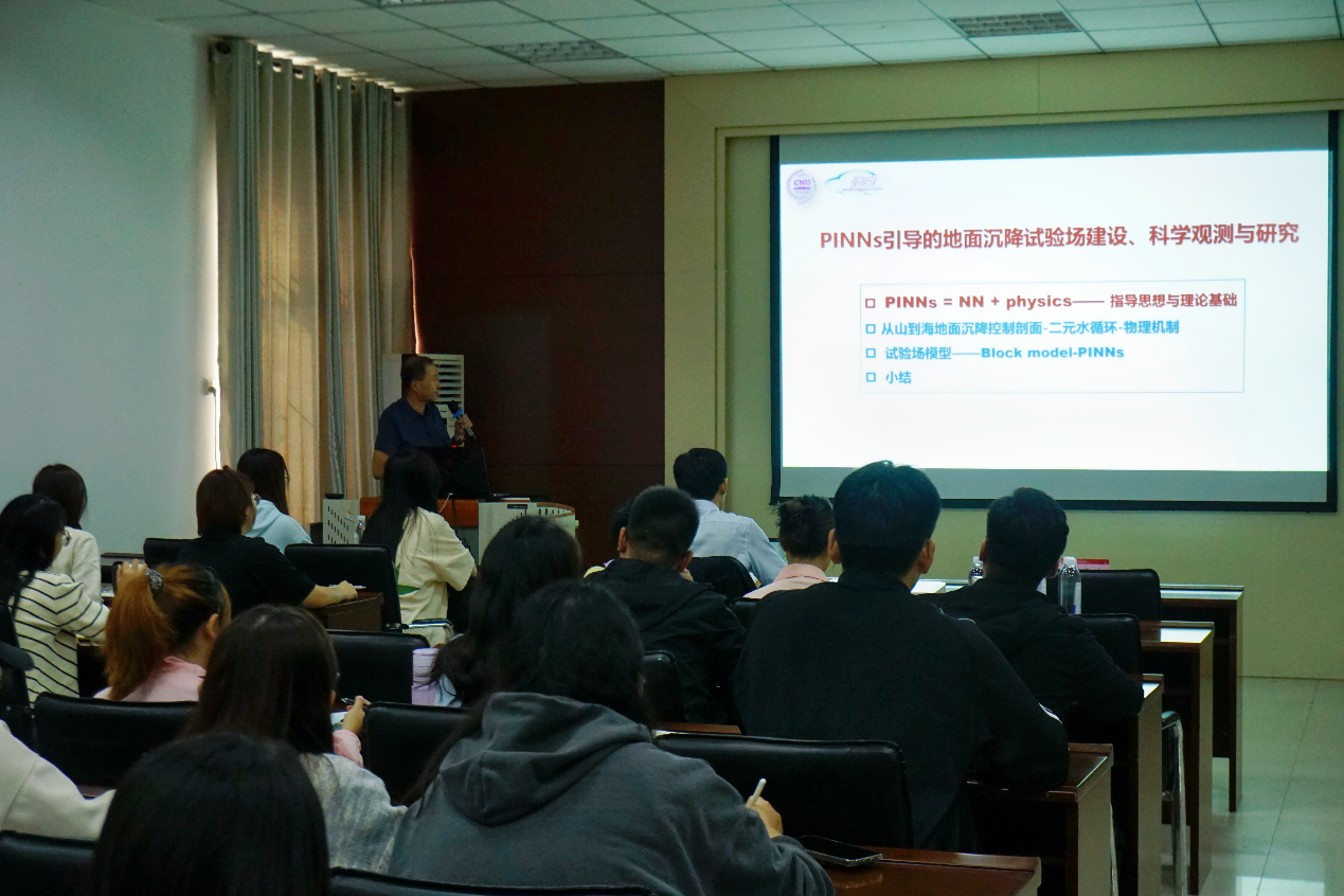 宫辉力教授的报告题目为《物理信息神经网络引导的地面沉降试验场建设、科学观测与研究》,报告结合国家新一期地面沉降监测试验场工程布设,根据国内外研究现状,针对PINN引导的地面沉降试验场建设、科学观测与研究的指导思想与理论基础等方面,详细介绍了地面沉降监测试验场模型。宫辉力教授指出,随着国家地面沉降监测试验场的大规模新建,为实现试验场高精度数值模型与深度学习模型耦合,构建物理信息神经网络(PINNS, Informed Neural Networks)模型,提供了新途径;在此基础上,为揭示区城地面沉降复杂演化机理,开展量化归因与调控阈值研究,提供了新方法。地理与环境学院副院长程钰教授对报告进行点评,宫教授与师生进行了深入的交流与讨论,细心地对大家的问题进行答疑释惑。