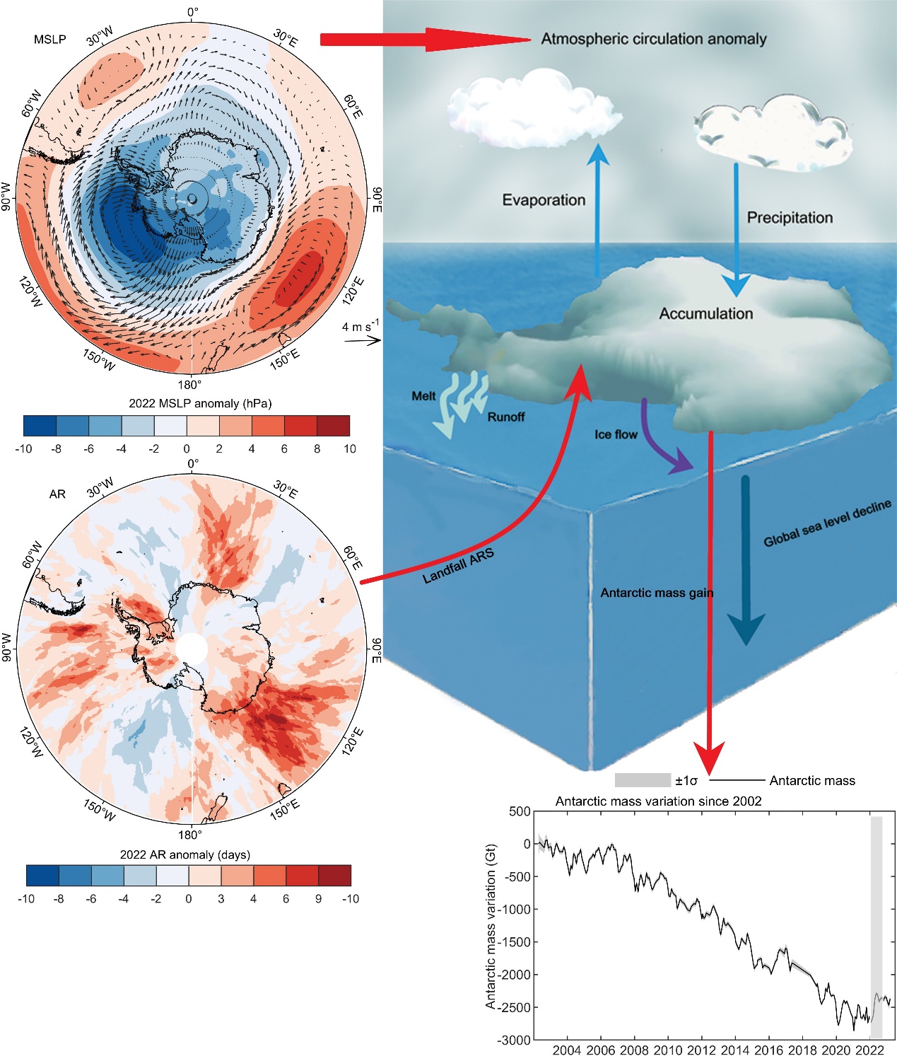 2022年南极降雪异常概况图。左上:2022年年平均海平面气压(MSLP)和850 hPa风异常的空间分布。左下:2022年大气河(AR)发生日数异常。右下:2002-2022年南极冰盖累计物质变化。垂直的灰色阴影区域表示2022年时间段。论文图。