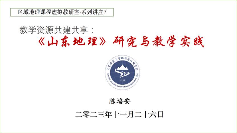 2023年11月26日下午,教育部区域地理课程虚拟教研室举办第七场讲座活动,讲座由我院陈培安副教授主讲,主题为“教学资源共建共享:《山东地理》研究与教学实践”。讲座采用线上方式在腾讯会议召开,由区域地理课程虚拟教研室负责人、北京师范大学地理学部党委书记苏筠教授主持,来自国内数十所高校的39人参加了本次教研活动。