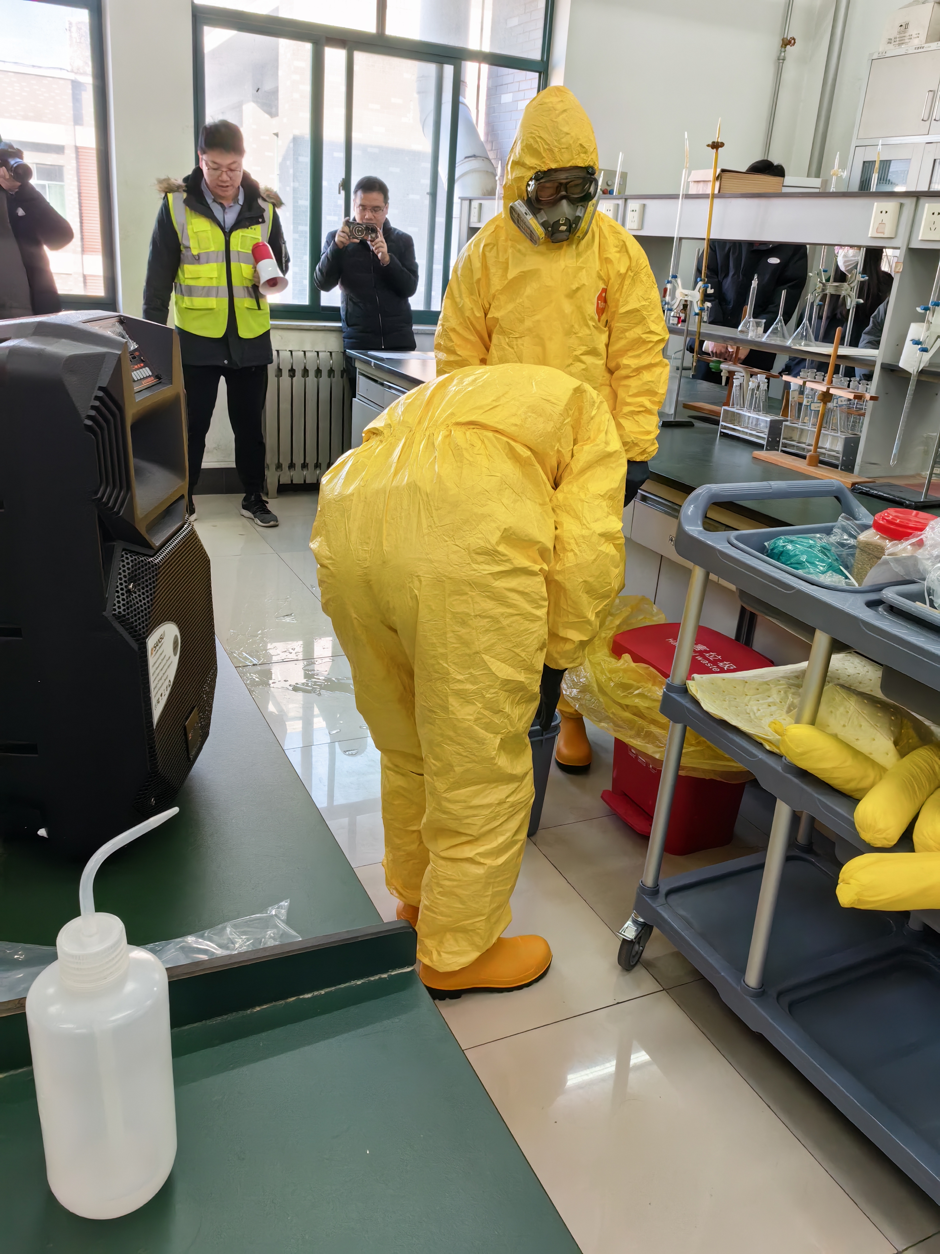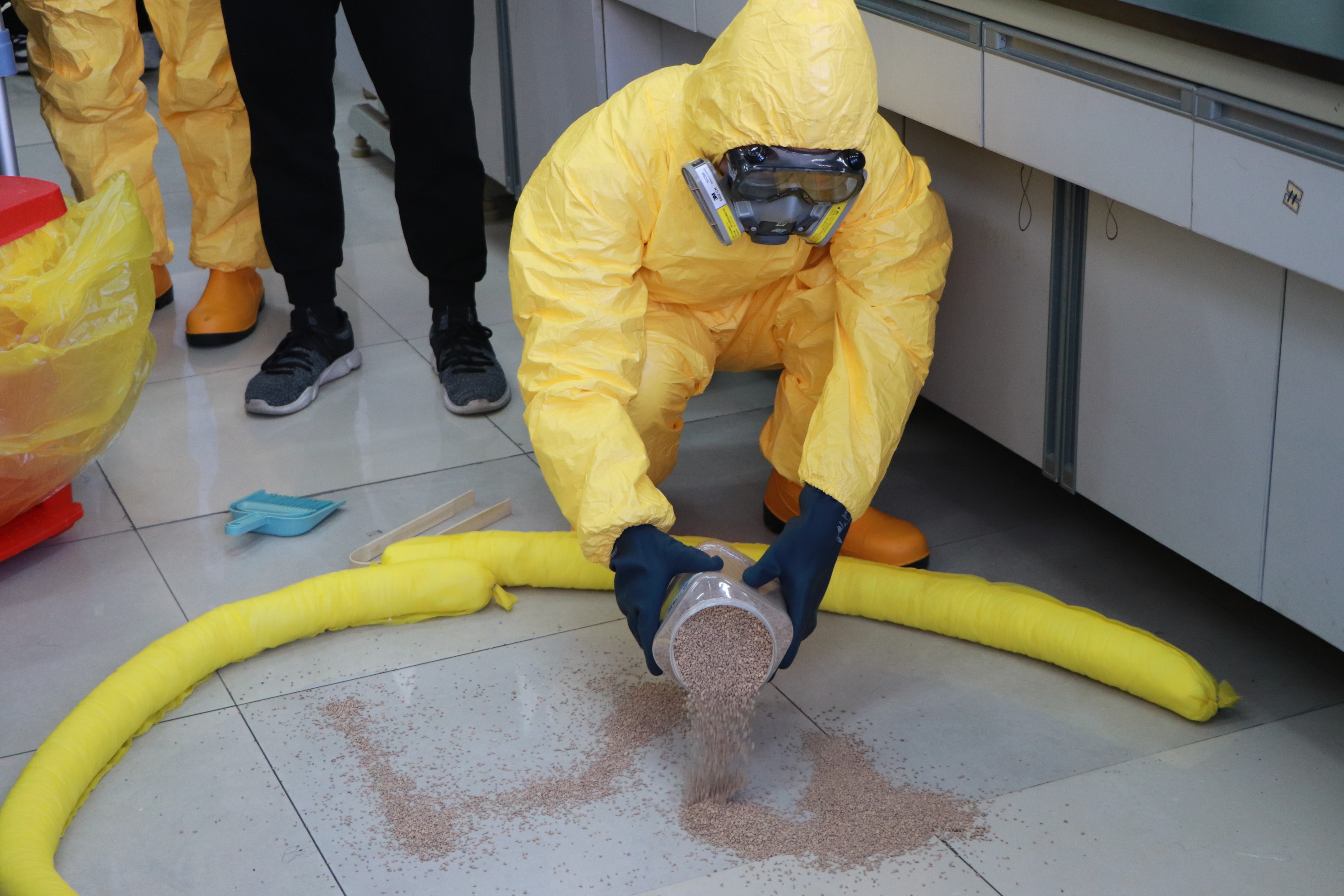 本次演练内容为模拟学生进行化学实验时不慎将管控类危险化学品硫酸溢洒&灼伤的突发安全事件应急处置场景。事故发生后,实验室安全员、实验室负责人第一时间进行专业处理、实施自救,并启动应急响应、逐级上报,学校实验室安全指导小组在评判分析后第一时间启动实验室安全事故应急预案,安全保卫处做好现场警戒,专业应急救援小组对发生事故实验室开展应急处置。演练前,学院在资产与实验室管理处指导下对整体的演练进行了精心的策划和严密的组织,进一步明确了演练步骤,将应急演练工作落到实处。演练中各小组反应迅速、协调有序、流程规范,达到了预期演练目的。此次实验室安全应急演练的顺利完成使抽象的安全意识变成具体的实战演练,增强了学院师生的安全意识与自护自救技能,帮助其掌握基本自救技能,为建设平安学院打下坚实基础。