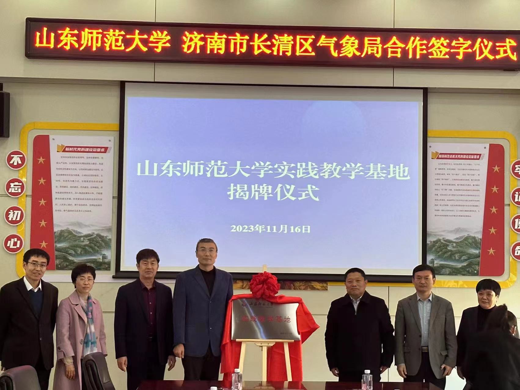 11月16日,山东师范大学地理与环境学院与济南市长清区气象局签署战略合作协议,并建立山东师范大学实践教学基地。双方将充分发挥科技、人才和资源等优势,在平台建设、科研攻关、成果转化及人才培养等方面深化合作,共同推进学院学科建设和气象领域高质量发展。长清区区委常委、副区长赵国,济南市气象局党组成员、纪检组组长郝家学,山东师范大学教务处副处长赵曰峰,地环学院党委书记刘永慧、院长王成新出席仪式并签署协议。山东师范大学教务处副处长赵曰峰,长清区气象局党组书记、局长王桂芳,地环学院院长王成新分别代表双方签署协议。