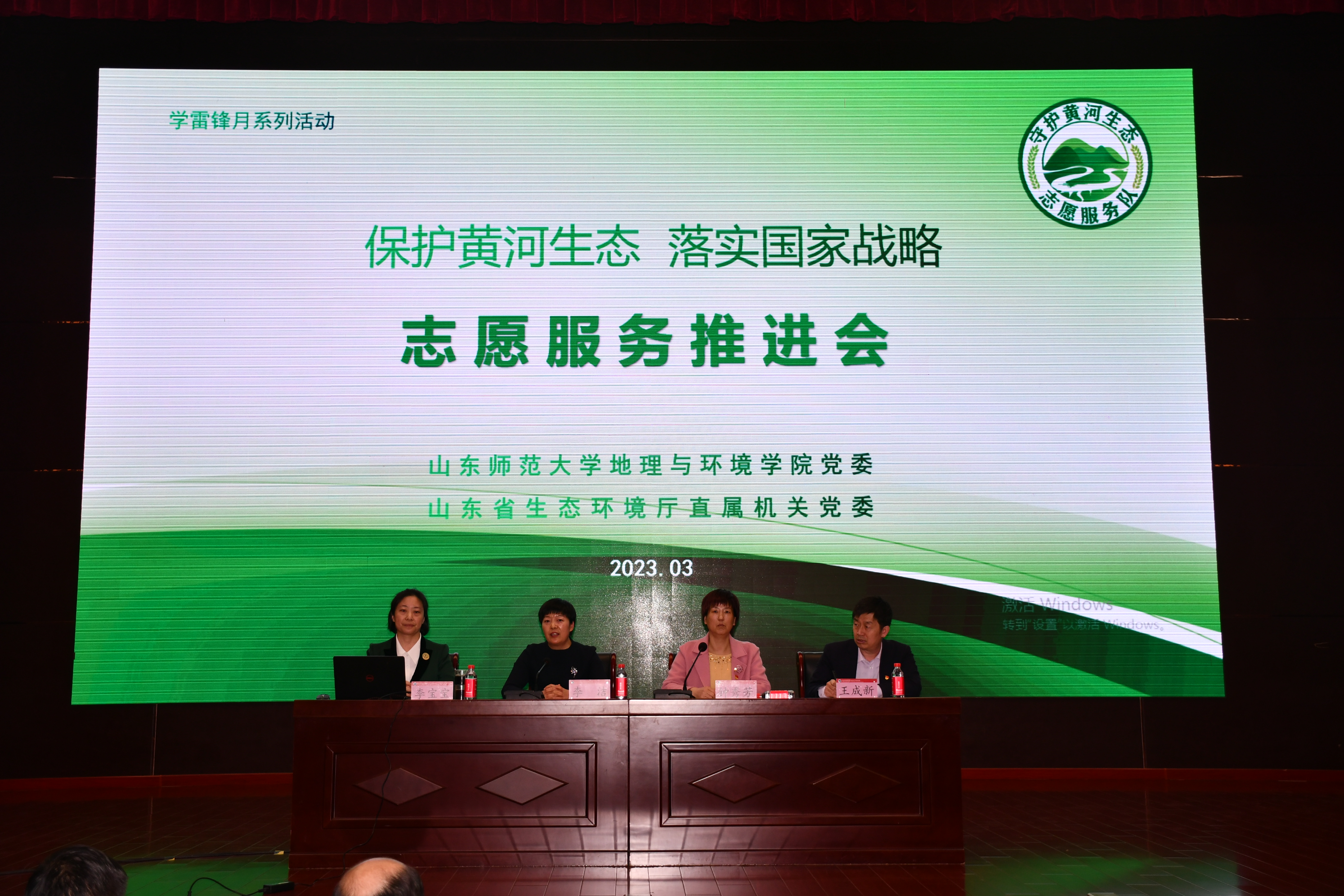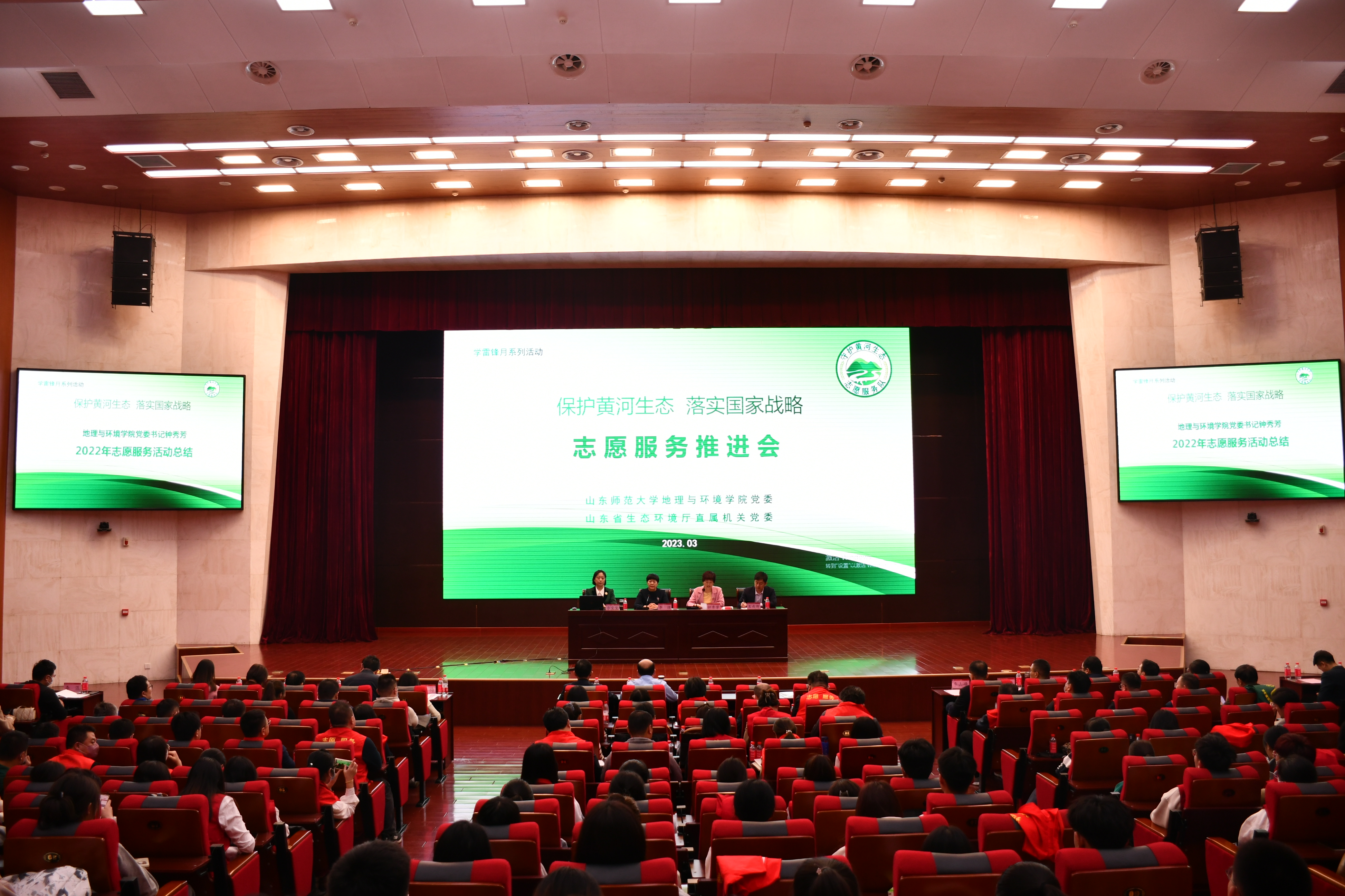 为深入贯彻落实党的二十大精神和习近平总书记在黄河流域生态保护和高质量发展上走在前的要求,结合总书记“雷锋精 神永不过时 学雷锋活动要融入日常”的重要指示,由山东师范大学地理与环境学院党委和山东省生态环境厅直属机关党委共同开展的“保护黄河生态 落实国家战略”志愿服务活动推进会,于3月9日在我校树蕙堂报告厅举行。山东省生态环境厅直属机关党委专职副书记和各中心负责同志,山东师范大学地理与环境学院党委书记钟秀芳,党委副书记、院长王成新,守护黄河生态志愿服务队志愿者代表近300人参加了本次活动。