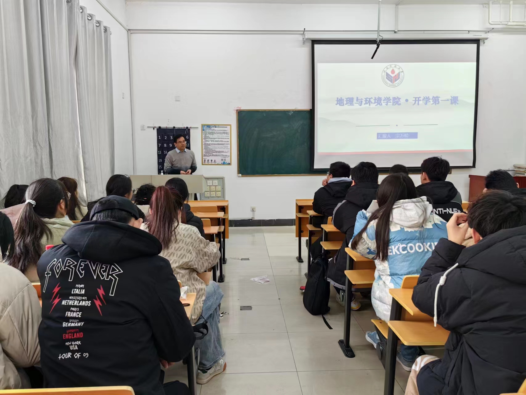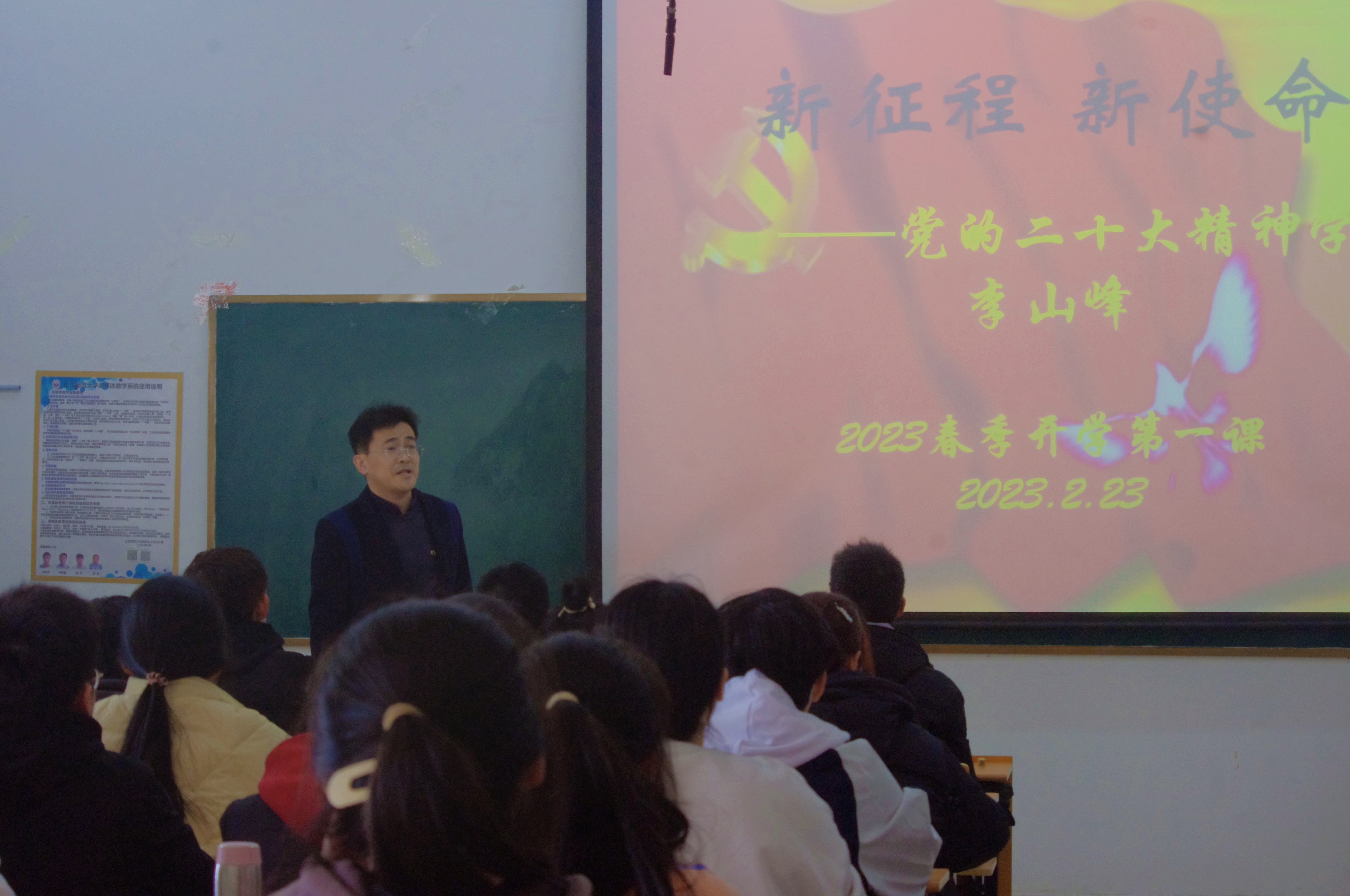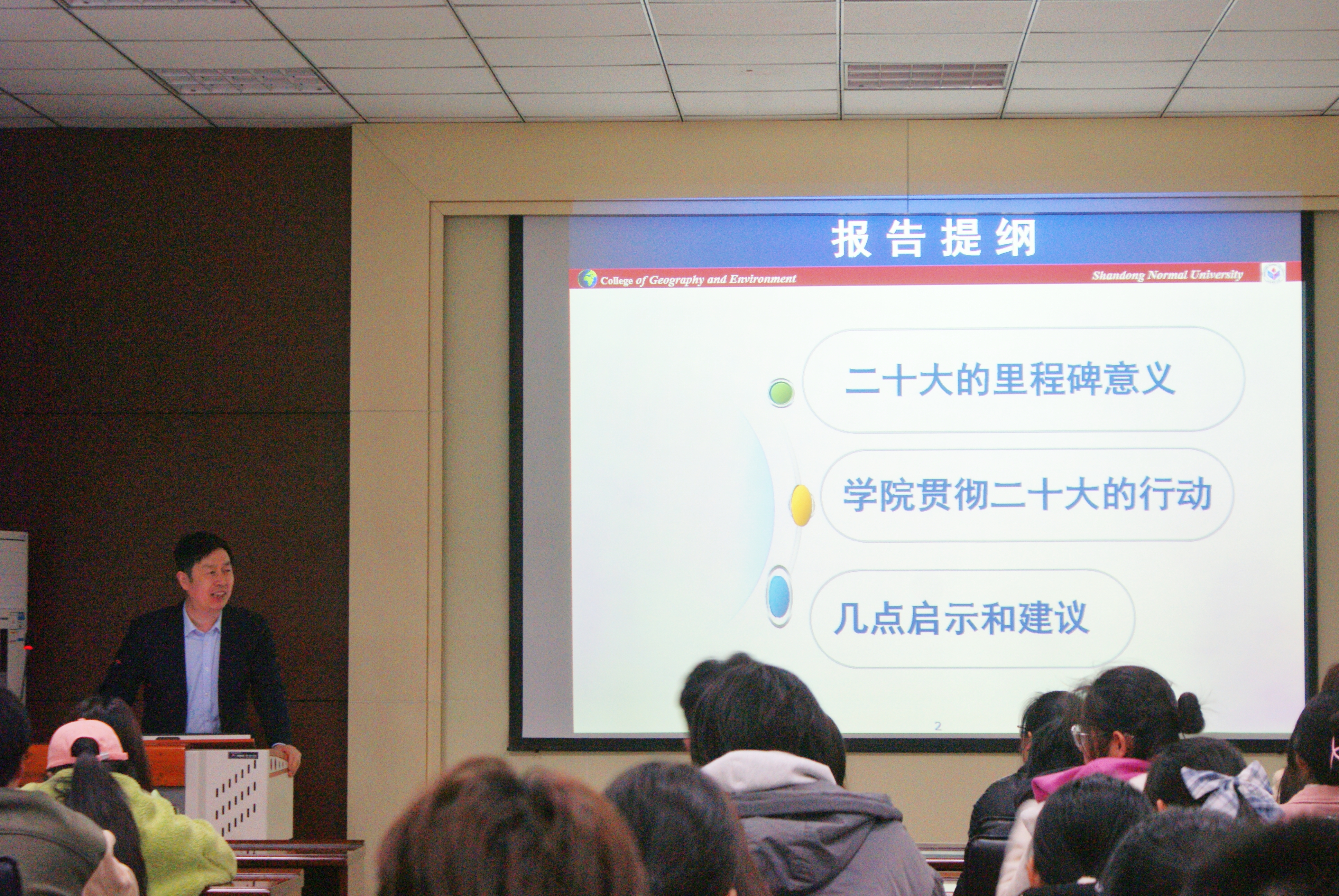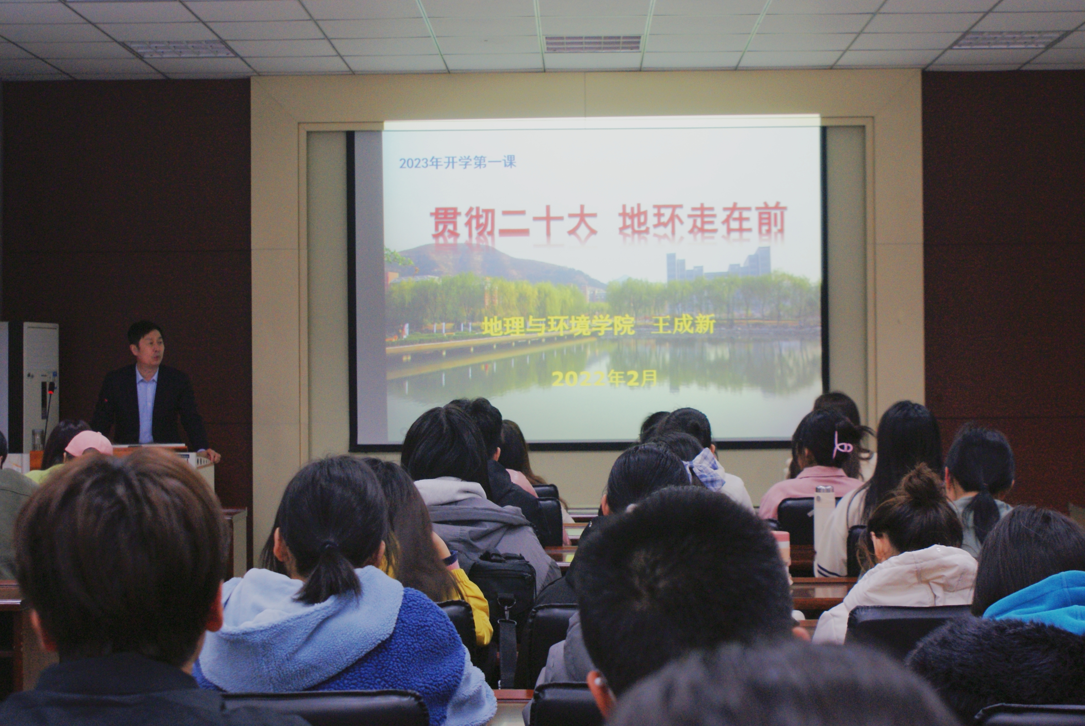 为助推同学们深入感悟、学习党的二十大会议精神,提升思想理论水平,结合学校对于“开学第一课”的部署要求,地理与环境学院于2月23日、24日于长清湖校区文澜楼开展了四场“开学第一课”主题报告,学院党委书记钟秀芳,党委副书记、院长王成新,党委副书记李山峰,副院长宗万松分别担任主讲人,为全学院百余名学生带来了新学期启智润心“第一课”。