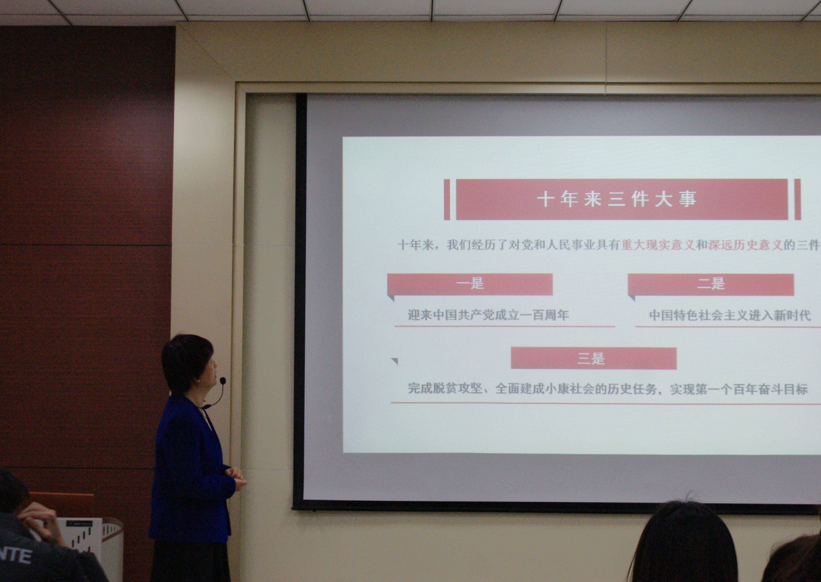 钟秀芳以《学习二十大 了解新党章》为主题,立足于党的二十大报告中提出的新思想、新理论,从“总结伟大成就”“阐述指导思想”“明确道路选择”“规划总体布局”和“强调政治保证”五个层面总结大会内容并分别展开讲述,她重点讲述了我国在脱贫攻坚进程中取得的巨大成就,以及中国从站起来、富起来到强起来的重大意义,极大地增强了在座同学的民族自信心和自豪感。随即,钟秀芳又着眼于“二十大对于《党章》修改的主要内容”“修改《党章》的原因”“历史上《党章》的修改历程”等方面,帮助同学们明确修改前后《党章》的区别,并特别强调了《党章》的修正顺应时代要求、体现人民意识,这是党的一个惯例,也是党理论创新和实践发展的需要。最后她通过列举青年榜样苏炳添、党员榜样张桂梅、奉献榜样刘崇等人的感人事迹,向当代大学生提出了要践行二十大精神的要求,并鼓励同学们在全面建设社会主义现代化国家的火热实践中绽放青春绚丽之花!