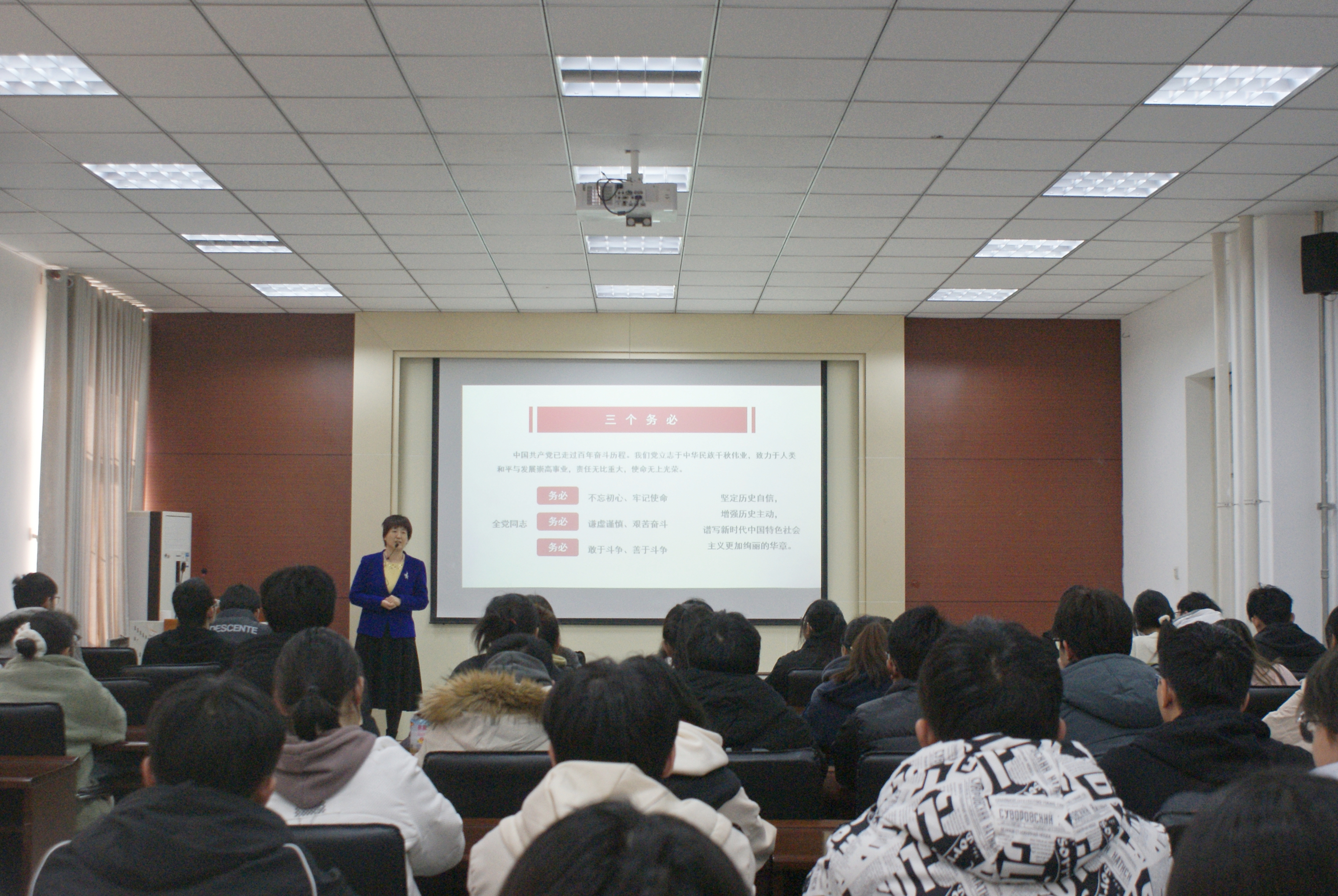 李山峰主讲的题目为《新征程,新使命——关于党的二十大精神学习》,他首先带领同学们回顾了党的二十大会议主题,对主题内容进行了具体地阐释,接着从党的二十大会议中的“三个务必”——“务必不忘初心、牢记使命,务必谦虚谨慎、艰苦奋斗,务必敢于斗争、善于斗争”着手,向同学们展开论述。他勉励同学们要认真学习、领悟、宣传好党的二十大精神,树立远大理想,用实际行动争当民族复兴大任的时代新人。