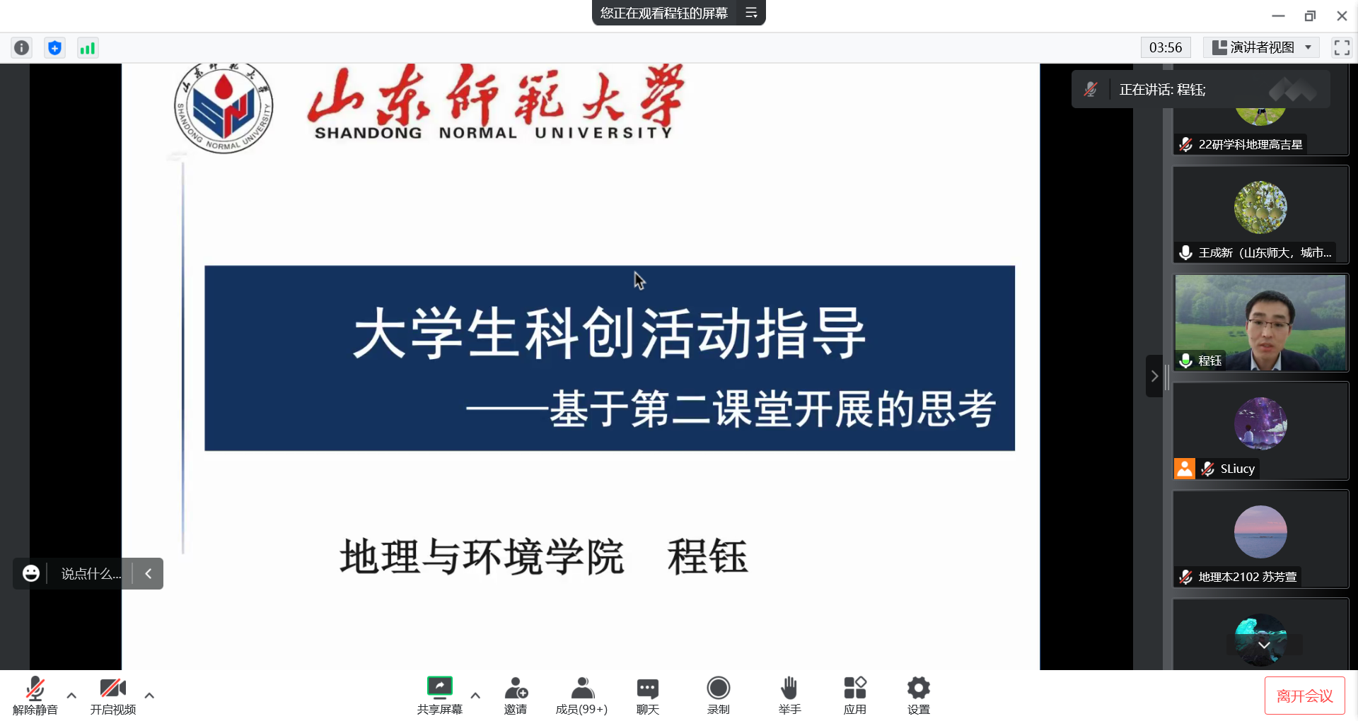 12月7日,山东师范大学地理与环境学院和教师教学发展中心联合主办的大学生科创活动指导讲座顺利举行。学院博士生导师程钰教授作题为“大学生科创活动指导——基于第二课堂开展的思考”的报告。本次讲座由地理与环境学院院长王成新主持,学院本科生和研究生共500余人参加。