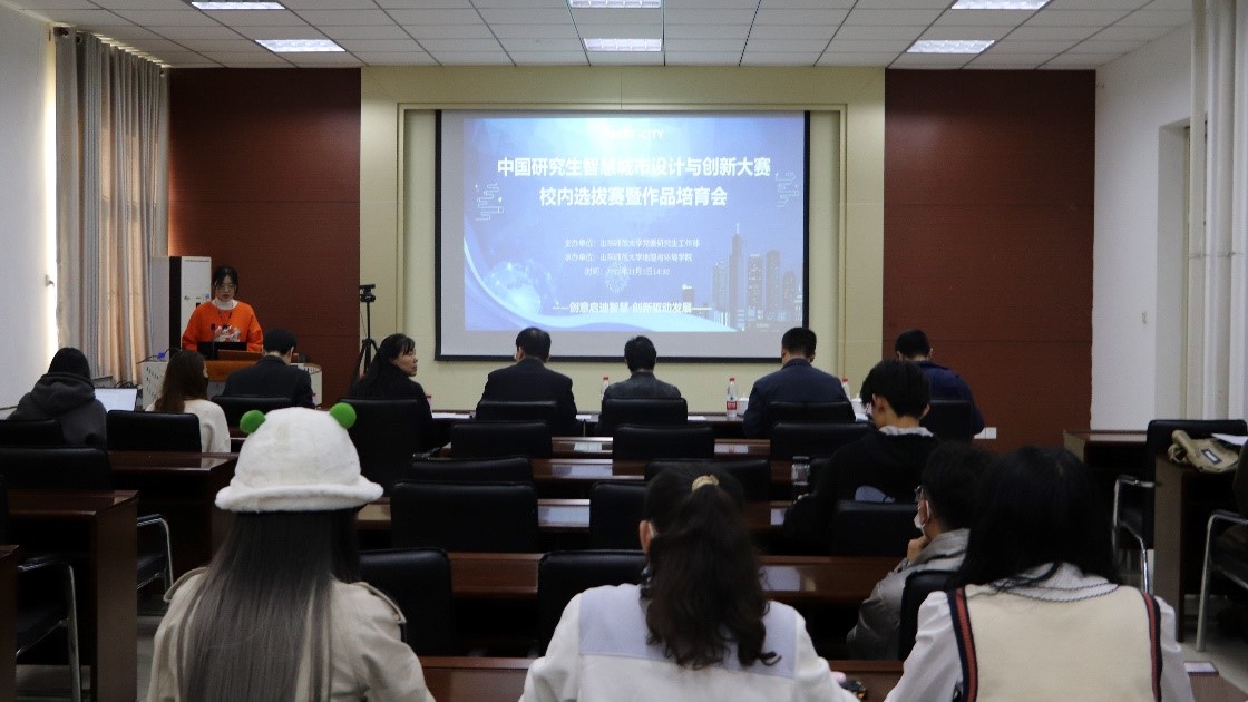 11月1日,由校党委研究生工作部主办,地理与环境学院承办的“中国研究生智慧城市设计与创新大赛”校内选拔赛暨作品培育会于山东师范大学长清湖校区文澜楼G210会议室举办。学院特邀校党委研究生工作部副部长张萌,学院党委副书记李山峰,副教授常军、韩荣青、徐飞,研究生辅导员高宝棣参加本次会议并担任评委。