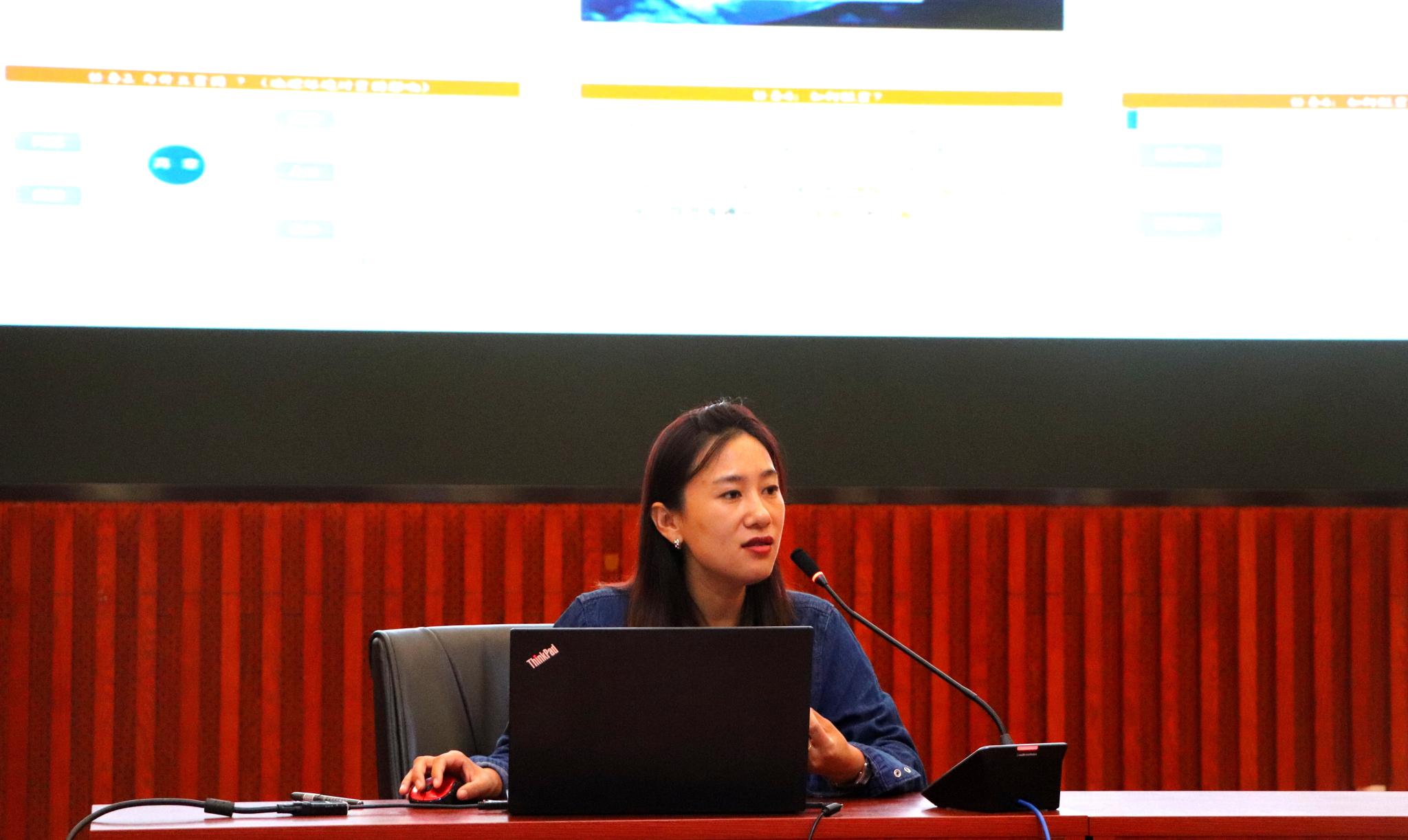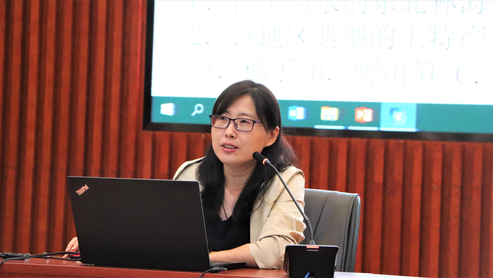 许贝贝从课程理念、课程内容、课程实施三大方面展开论述,她强调教学要始终坚持以学生为中心的课程理念,同时要重视前期备课,在课程内容方面应注重生活与地理知识的联系,要善于引导学生从地理的视角分析问题。最后,她借助“黄河对济南北跨发展的影响”这一现实教学案例,和同学们深入探讨了地理教学实施中的巧妙设计。