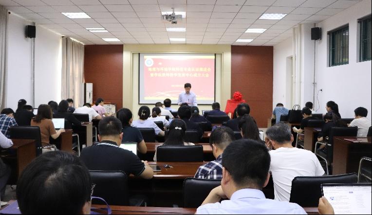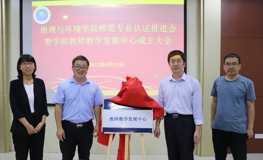 丁同楼在致辞中强调,人才培养的关键是提高教学质量,重点是提高课堂教学质量,突破口是提高教师的教学能力。地理与环境学院始终紧密围绕学校发展的中心工作和教师成长成才的实际需要,在教育教学工作中取得了显著成效,此次学院教师教学发展中心的成立,必然使学院的教学工作、师资培养工作更上一层楼。王成新从“发展定位”、“师资培训”、“教学研究”三方面阐明了学院教师教学发展中心的工作目标,希望各专业、各学科都能协同共促、高质量发展。教师教学发展中心成立后会积极汇集各方优势资源,充分发挥其作用。他代表学院承诺,会全力支持教师教学的发展。随后,王成新、丁同楼、潘婷、宗万松共同为教师教学发展中心揭牌。新成立的学院教师教学发展中心主任张宝雷进行的表态发展中表示教师教学发展中心将为各位教师提供更多指导,建设成为教师之友、教师之家,服务于老师拼搏向上的阶梯。随后,张晓青作《专业认证报告》,学院博士生导师刘恩峰教授作《学生评价体系达成度解读》报告,徐真真作《优秀课件制作讲解》报告。