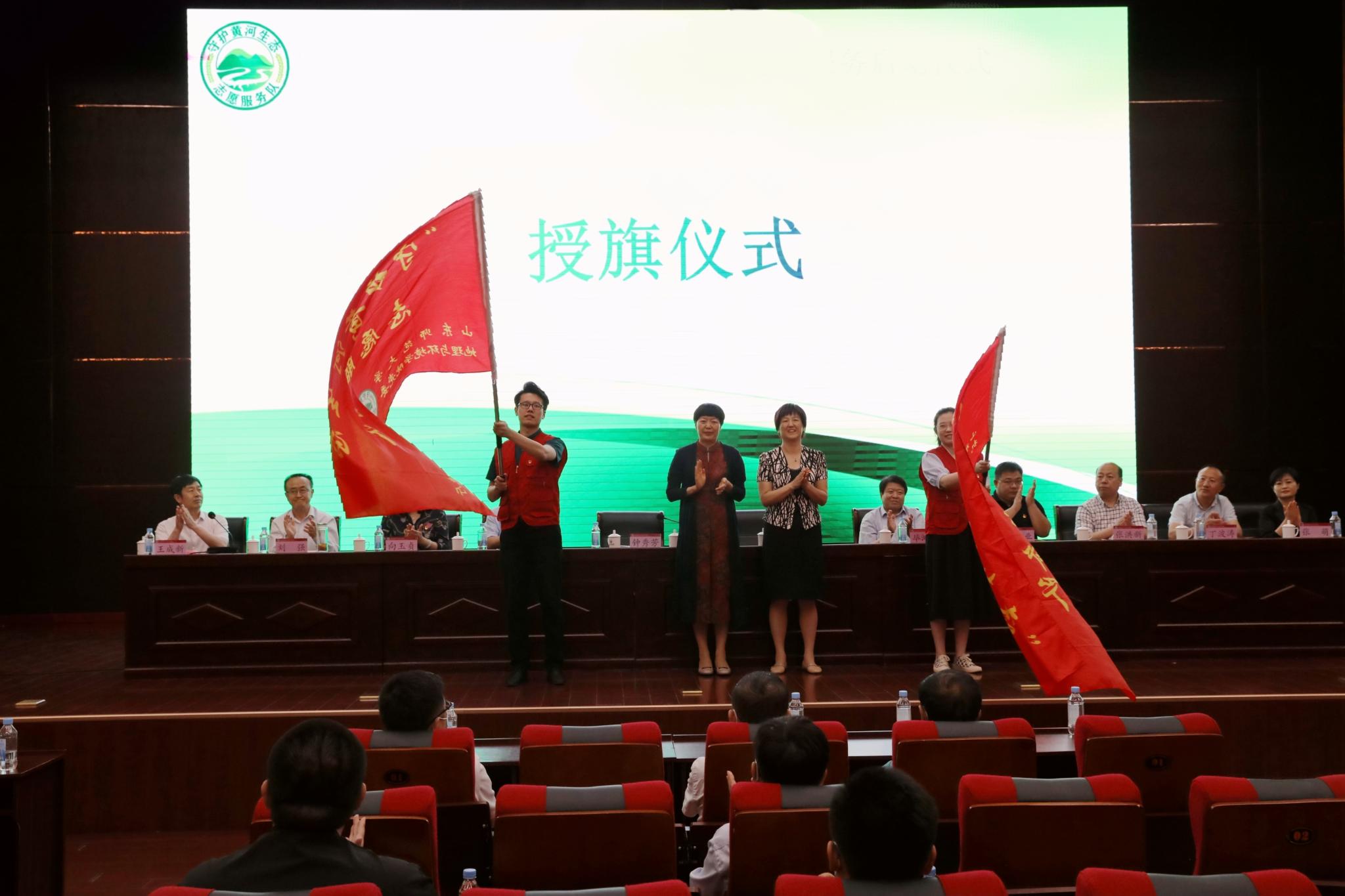 会上宣布成立“守护黄河生态”志愿服务队并为志愿服务队进行了授旗,济南市生态环境局长清分局党组书记、局长、一级调研员张勇、省生态环境规划院院长助理丁波涛、“第九届‘保护母亲河奖——绿色卫士奖’”获得者、地理与环境学院徐飞副教授以及双方志愿者分别表态发言。