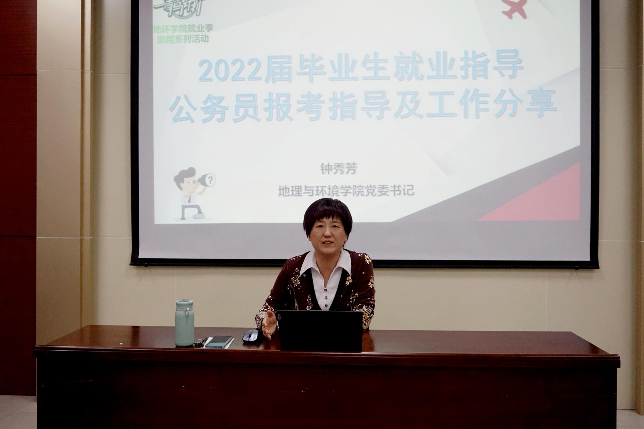 4月21日,“助翔行动”开启了首场择业指导报告,学院党委书记钟秀芳以《公务员报考指导及工作分享》为题,通过“线上+线下”的形式为学院本科生、研究生毕业生做了专题分享。分享中,钟秀芳结合自身丰富的基层工作经验,与同学们分享了公务员报考流程以及公务员工作实物,通过介绍“公务员的工作性质”、“公务员的晋升途径”、“公务员应具备的素质”等相关讲解,帮助同学们拓宽就业、择业视野,坚定信念、勇毅前行。分享会在线观看人数近200人,吸引经济学院、新闻与传媒学院、历史文化学院等诸多其他学院毕业生前来学习交流,营造了良好的常态化疫情防控下的就业指导文化氛围。