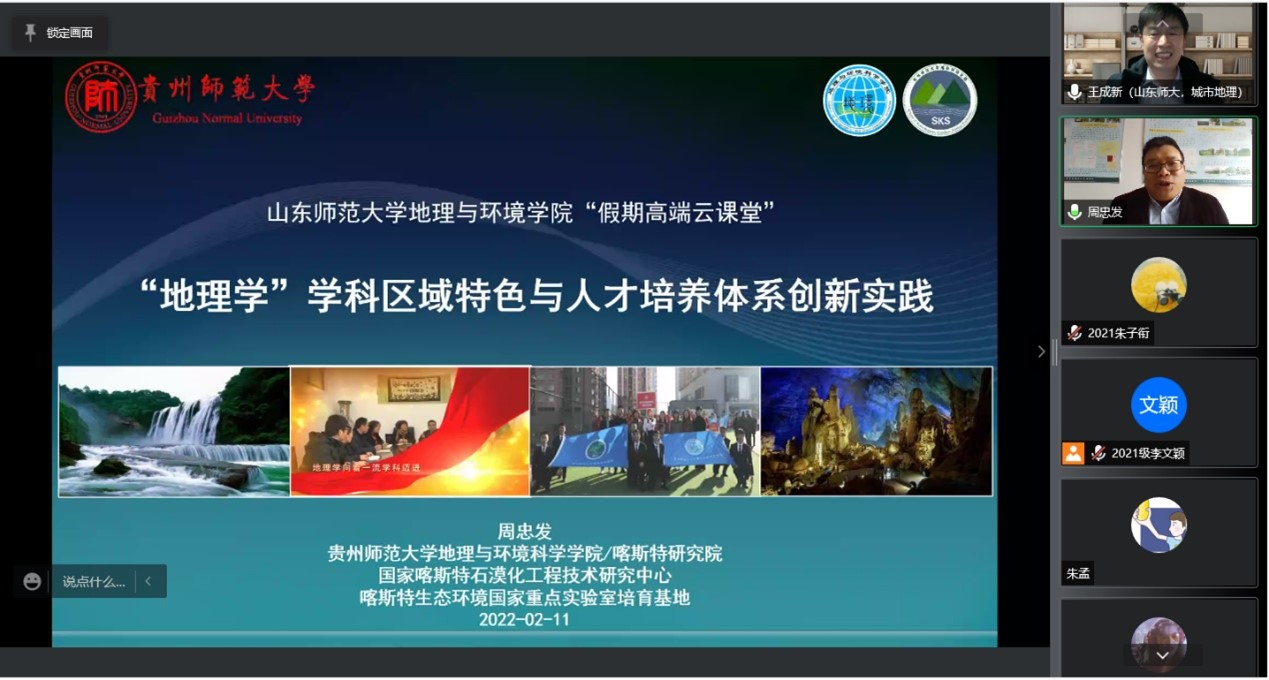 2月11日,“假期高端云课堂”第六讲由贵州师范大学地理与环境科学学院院长周忠发教授主讲,课程题目为“地理学—学科区域特色与人才培养体系创新实践”。该课程通过腾讯会议和哔哩哔哩平台线上同步举行。山东师大地理与环境学院院长王成新教授主持,600余名师生线上参加了此次讲坛。