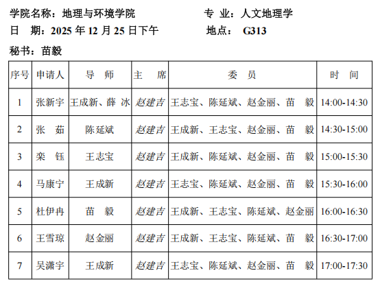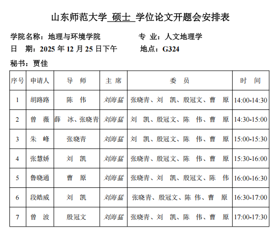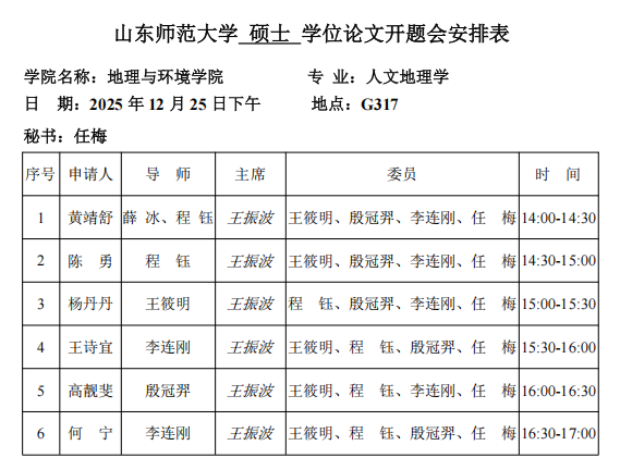 山东师范大学地理与环境学院2023级人文地理学硕士研究生学位论文中期检查安排2025.12.25