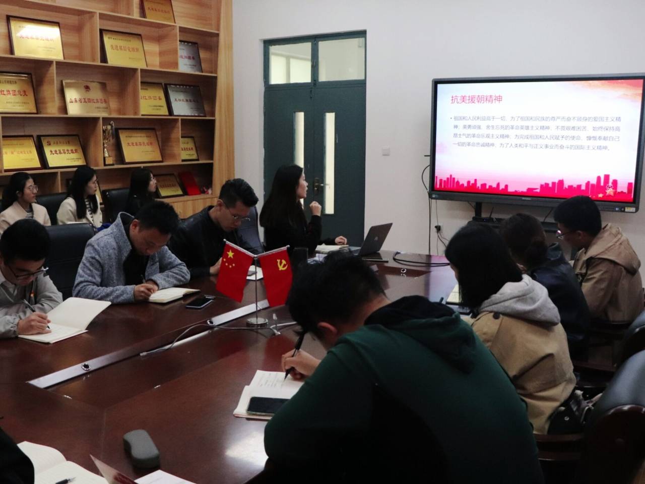 韩诗从“回望峥嵘岁月”、“重讲英模故事”和“如何继承和发扬抗美援朝精神”三个方面,对抗美援朝精神及其在新时代的意义与延续价值进行了讲述,通过学习抗美援朝这段历史和中国人民志愿军的光荣事迹,全体党员和入党积极分子都深受洗礼,倍加感动。支部书记欧阳德龙带领与会人员集中观看学习了习近平总书记在参观纪念中国人民志愿军抗美援朝70周年展览会上的重要讲话,他号召大家,要在幸福、平安的年代,始终坚持高举新时代中国特色社会主义伟大旗帜,努力走好新时代的长征路,传承好红色基因,将抗美援朝精神与自己的学习生活相结合,使其成为克服一切艰难险阻、战胜一切强大敌人的“利器”。会后,支部党员纷纷在宿舍生活园区辐射带动本年级学生观看了抗美援朝精神相关教育视频,并进行了广泛讨论。