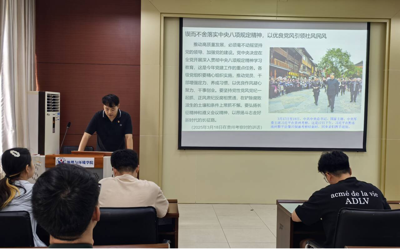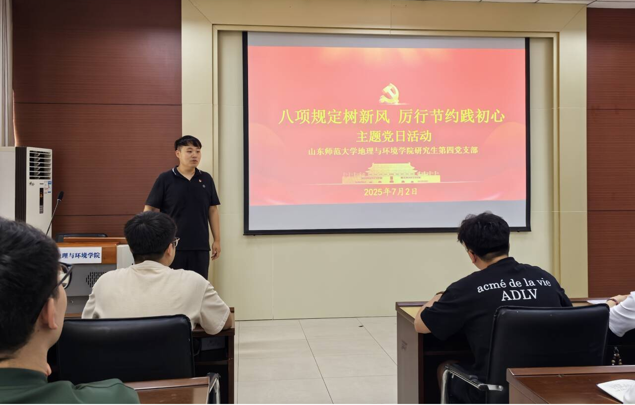 为扎实推进中央八项规定精神学习教育走深走实,2025年7月2日,山东师范大学地理与环境学院研究生第四党支部在文澜楼G210报告厅组织开展了“八项规定树新风 厉行节约践初心”主题党日活动。支部全体党员积极参与,深入研讨。