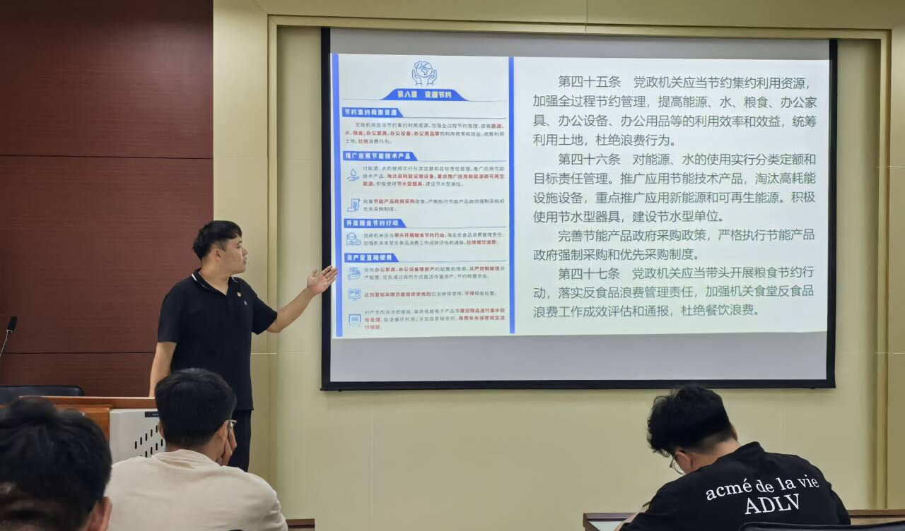随后,亓广志同志领学了修订后的《党政机关厉行节约反对浪费条例》,并组织支部党员分章节进行轮读学习,逐条对照、深入理解。大家一致认为,节约不是口号,而要内化于心、外化于行,在今后的学习生活中自觉践行勤俭节约的优良传统,弘扬新风正气。