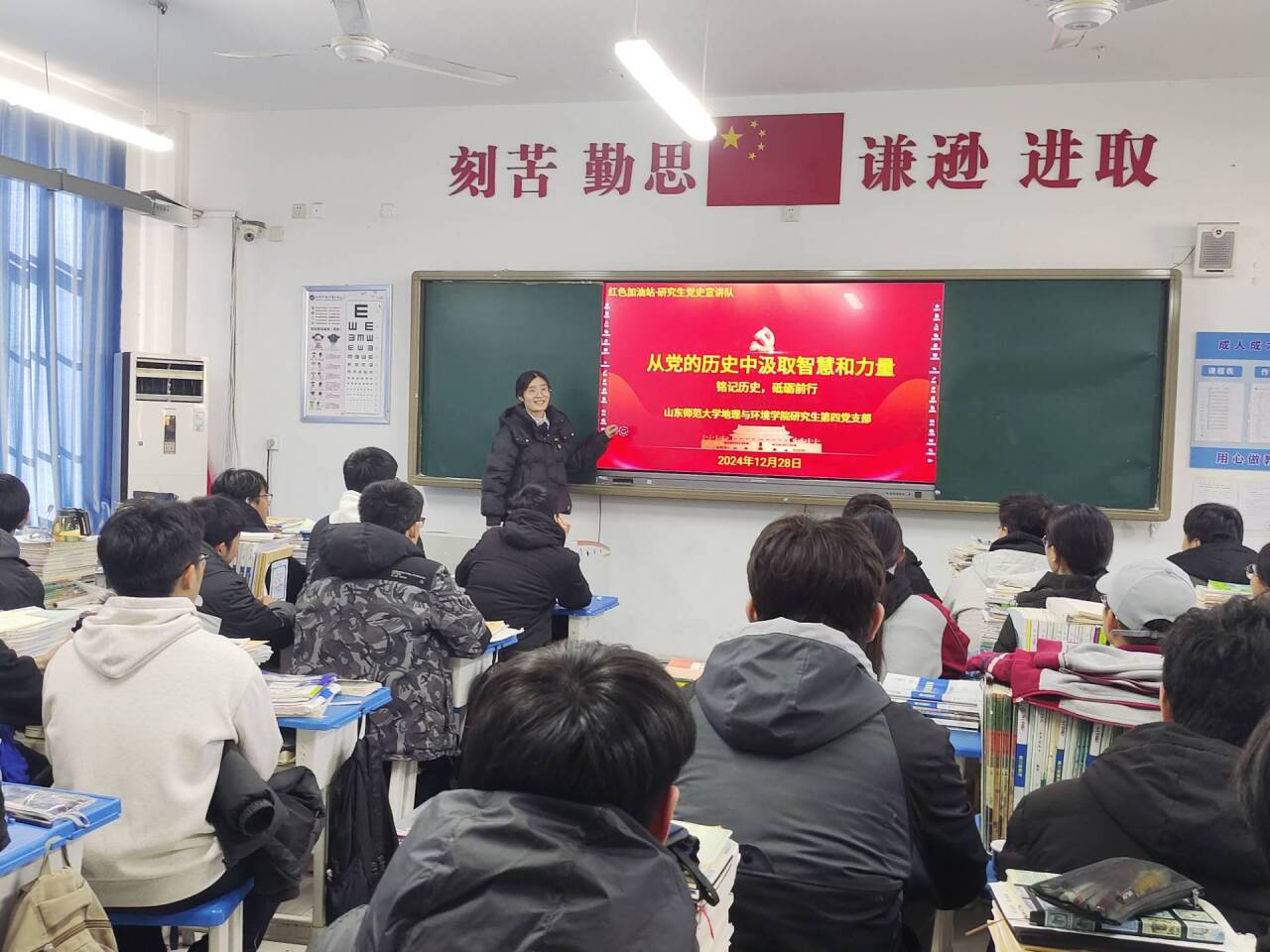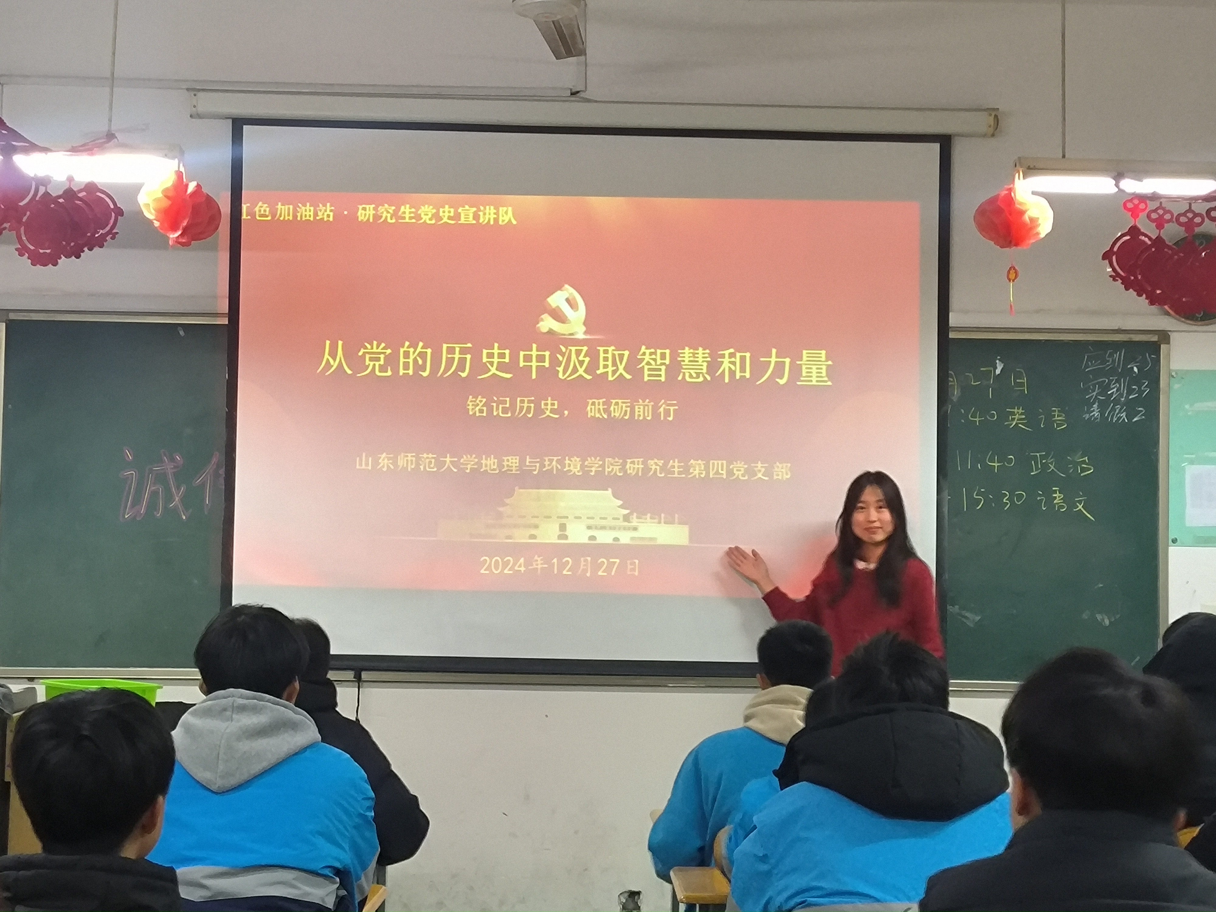 为全面贯彻党的二十大和二十届二中、三中全会精神,进一步贯彻落实2024年中共中央《党史学习教育工作条例》的要求,巩固拓展党史学习教育成果,推动党的创新理论和红色精神走进新时代,山东师范大学地理与环境学院研究生第四党支部在学院党委的指导下,依托党建品牌“红色加油站·研究生党史宣讲队”,成立了一支研究生党史宣讲队。该队伍通过深度融合红色基因与青年学生的思想政治教育,引领青年一代追寻红色足迹、传承革命精神,从党的历史中汲取智慧和力量。宣讲队为多所中学的师生带来了沉浸式红色教育新体验,助力青少年群体树立坚定理想信念,推动红色精神在青年一代中扎根发芽,为全面推进中华民族伟大复兴贡献青春力量。