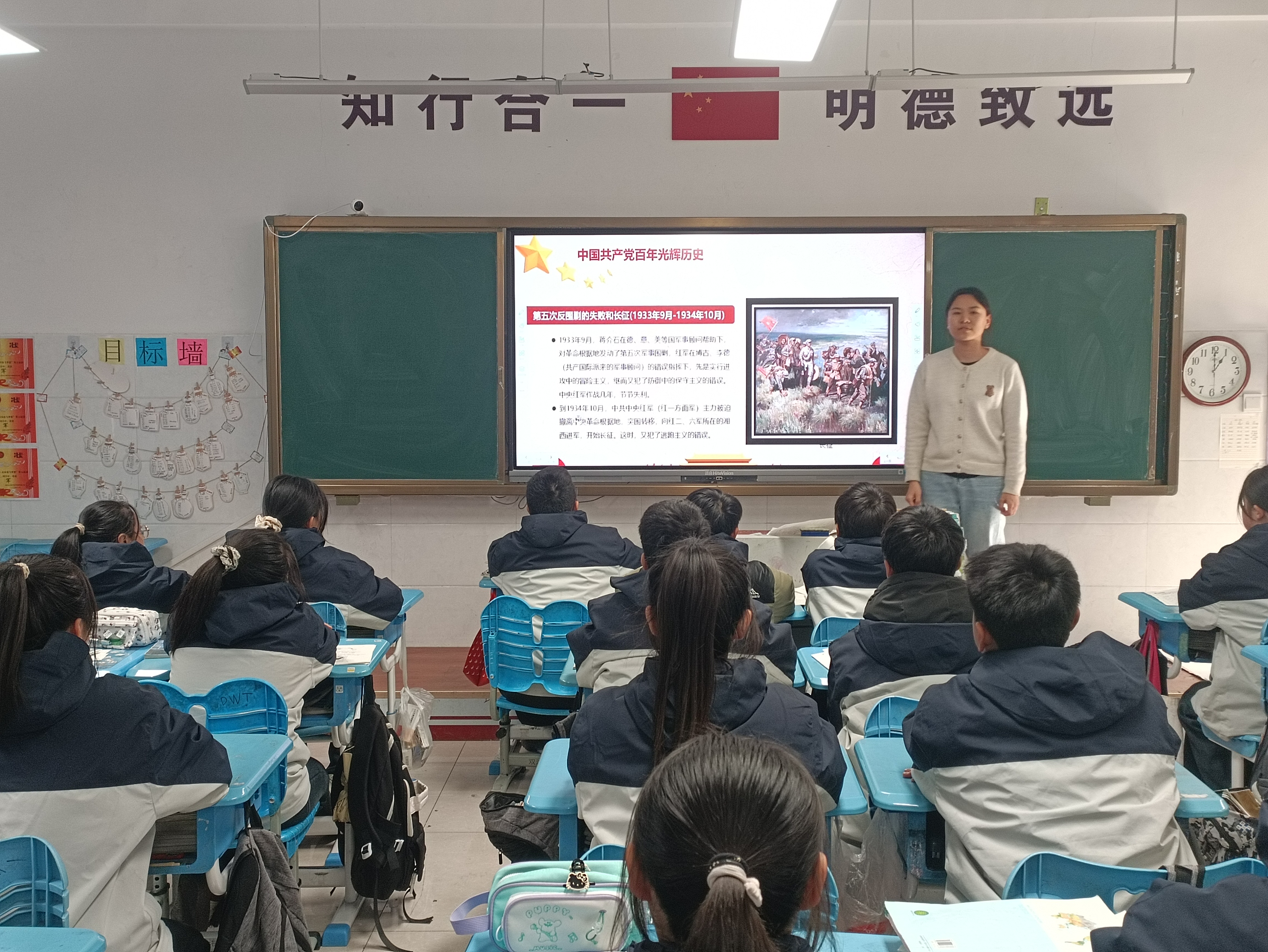 “红色加油站·研究生党史宣讲队”创新宣讲形式,打破传统宣讲的模式,结合中学思政课程特点,以“理论+实践”“故事+互动”的方式开展活动。在专题课堂中,宣讲队成员尚婧琳通过展示红军战士的日记手稿以及实地走访叶坪革命旧址的影像资料,让学生更加直观地感受到长征路上的艰辛与伟大,激发了他们对革命精神的敬仰与追求。