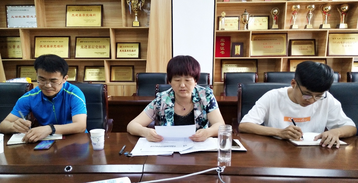 6月11日下午地理与环境学院党委召开支部书记会议,讨论品牌党建项目建设、“党员先锋出彩行动”等工作,会议由地理与环境学院党委书记钟秀芳主持,党委副书记李山峰、组织员和各支部书记参加会议。