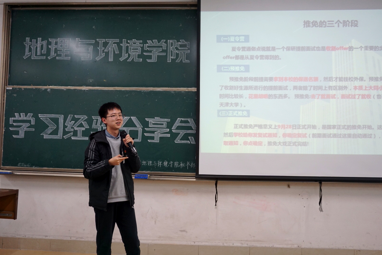 为进一步激发学院青年向学、善学、勤学的动力,增强同学们对保研相关流程的了解,掌握系统全面的学习方法,11月6日地理与环境学院学生第一党支部联合学生会秘书处于长清湖校区文渊楼C座121教室组织开展了“学党史,办实事”系列活动——2018级保研学生学习经验分享会,本次交流会邀请了学院学生第一党支部党员以及入党积极分子王焓屹、白广一、郭新蕊和姚剑宇四名同学进行了学习经验分享。学院2019级部分同学到场聆听。
