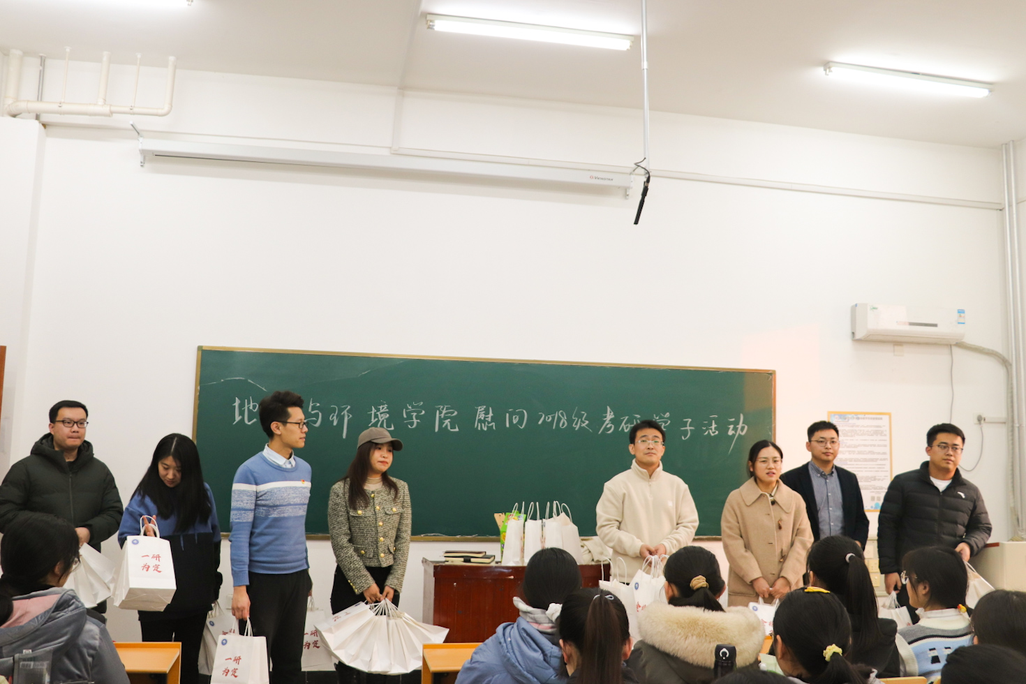 12月9日下午,在地理与环境学院学院团委和学生第一党支部的组织筹备下,学院于长清湖校区文澜楼B区考研自习教室举行“温暖传递·一‘研’为定”慰问考研生送温暖活动。学院党委副书记李山峰,团委书记、学工办主任李妮娜和全体辅导员共同为备考学子们送上了慰问祝福。