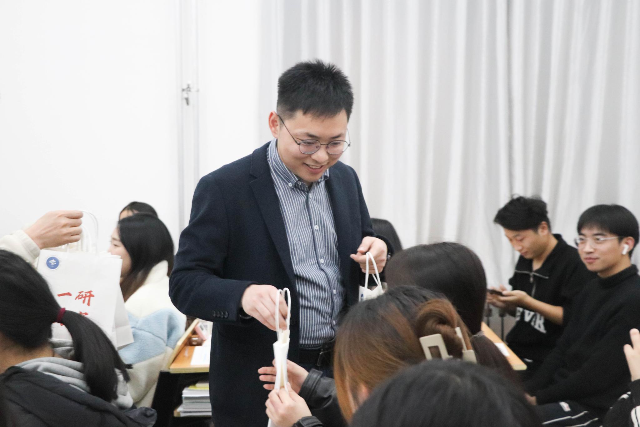 李山峰向备考学子表达了殷切的希望,鼓励考生一是要坚定理想、持之以恒,在复习过程中,树立必胜的信心;二是要合理规划、有序备考,调整好复习备考的心态,制订好小目标;三是要加强锻炼、劳逸结合,健康的身体和积极的心态是奋斗的根基。毕业生辅导员陶艺和欧阳德龙,分别就省教育厅对于疫情常态化管控下考生考试要求以及备考冲刺阶段饮食作息注意事项等问题,向同学们做出了温馨提示。随后各位老师为同学们发放了写有考研祝福的“福袋”并向每位考生送上了真挚的祝福。