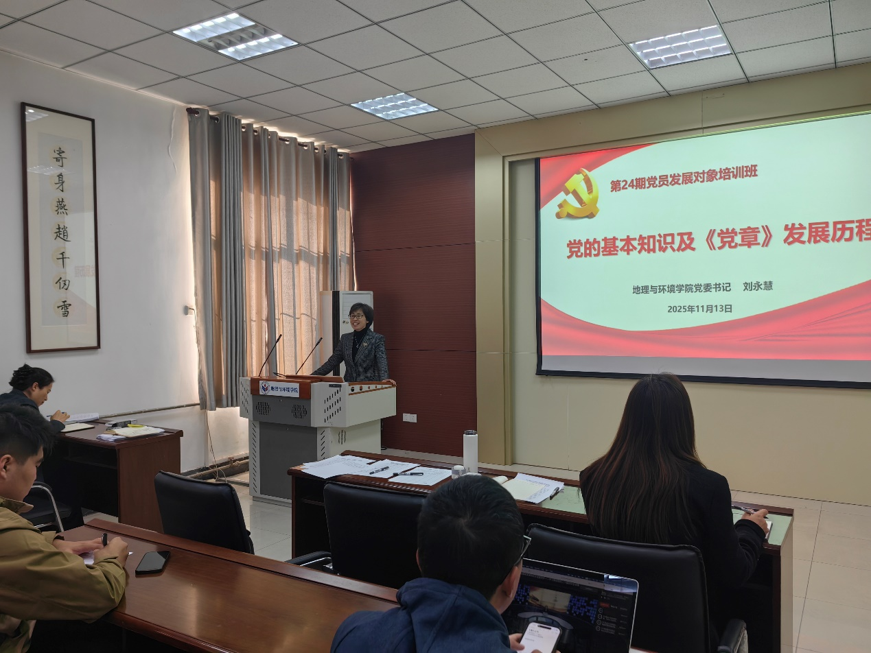 为深入学习贯彻习近平新时代中国特色社会主义思想和党的二十大精神,扎实推进党员发展工作,严把党员队伍“入口关”,切实加强对党员发展对象的思想政治引领,11月13日,地理与环境学院党委举办第24期党员发展对象培训班开班仪式。学院党委书记刘永慧出席活动并作总结讲话,并为学员们带来《党的基本知识及〈党章〉发展历程》专题授课。活动由学院组织员、培训班班主任袁安宁主持,学院学生党支部书记、辅导员代表及本期培训班全体学员参加。