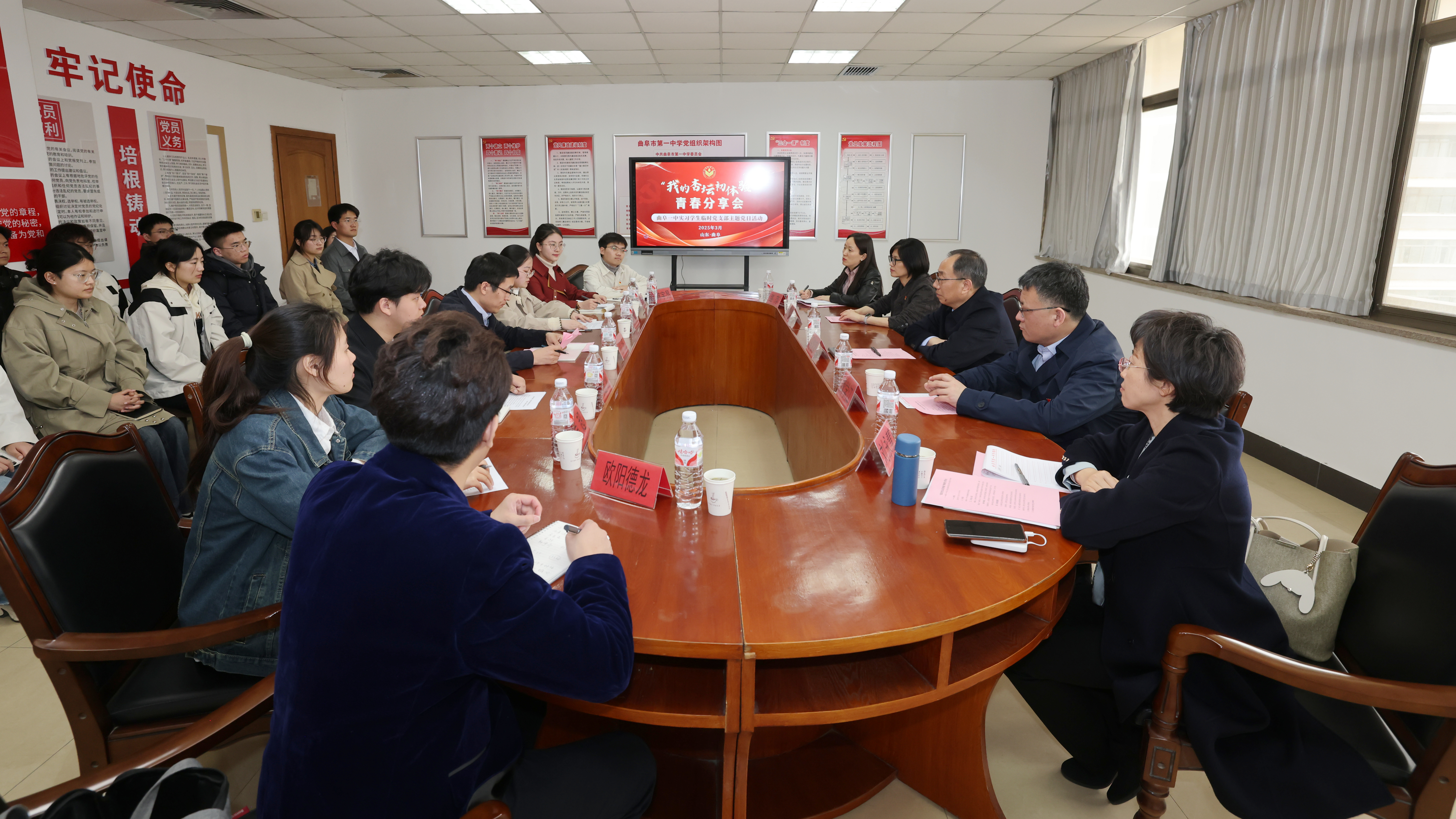 3月27日,地理与环境学院曲阜一中实习学生临时党支部在曲阜一中行政楼党员活动室举行了“我的杏坛初体验”青春分享会主题党日活动。校党委书记冯继康,校党委常委、组织部部长魏学江,教务处处长乔翠霞,地理与环境学院党委书记刘永慧,党委组织部副部长路萍等列席活动,实习学生临时党支部书记、地理与环境学院副院长程钰,临时党支部党建工作指导员、地理与环境学院辅导员欧阳德龙,临时党支部全体学生党员、入党积极分子和全体实习学生参加了活动。活动由程钰主持。