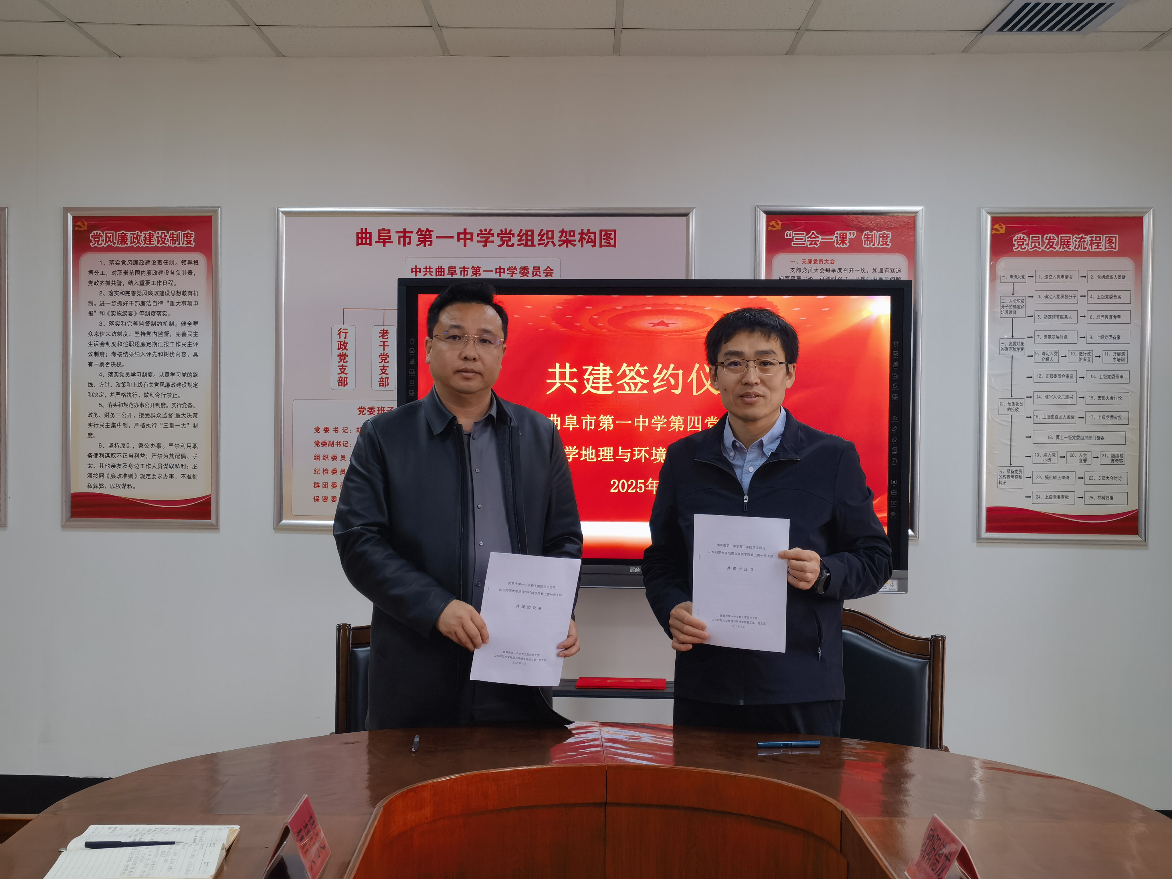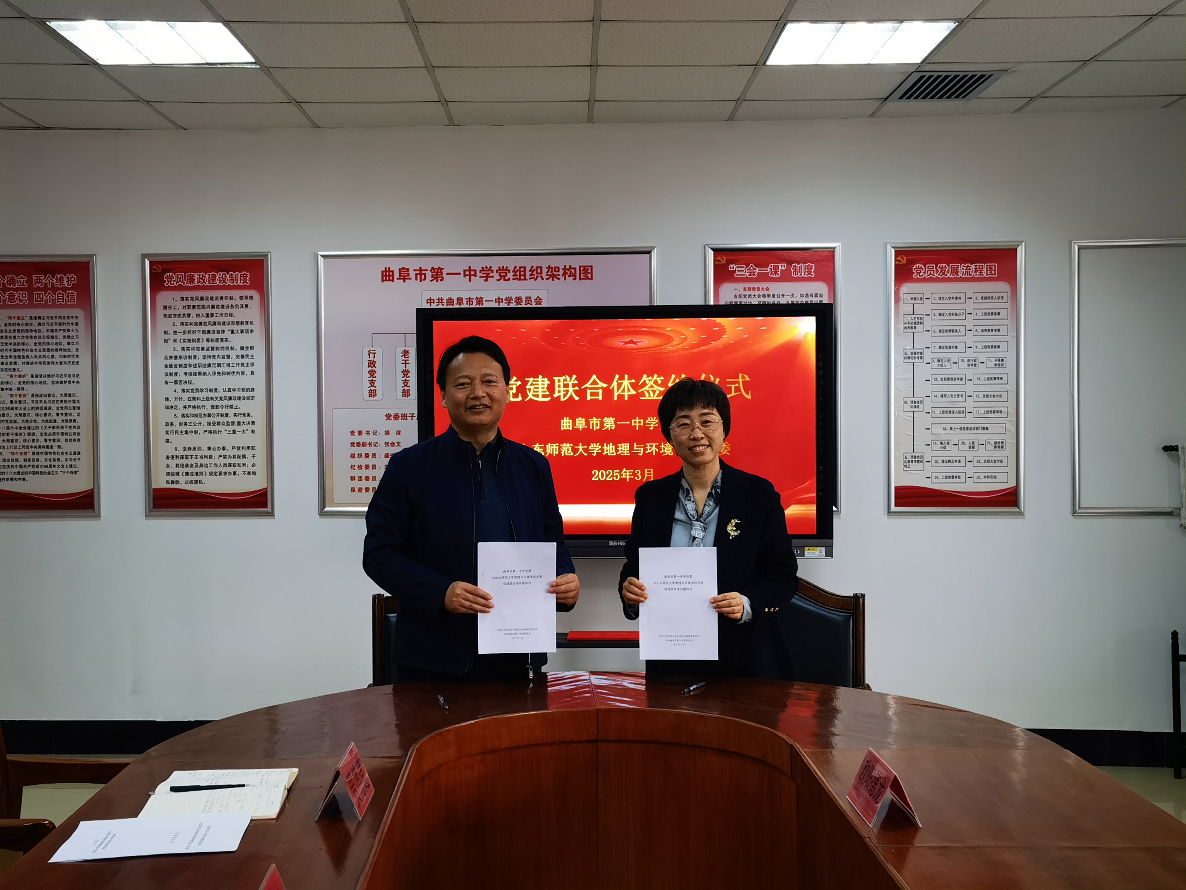 随后,双方从党委层面和党支部层面党建共建进行了磋商交流,刘永慧和胡滨代表双方党委签订了《曲阜市第一中学党委与山东师范大学地理与环境学院党委党建联合体共建协议》,程钰与曲阜市第一中学科技部主任贾德建代表各自党支部签订了《曲阜市第一中学第四党支部与山东师范大学地理与环境学院教工第一党支部共建协议》。