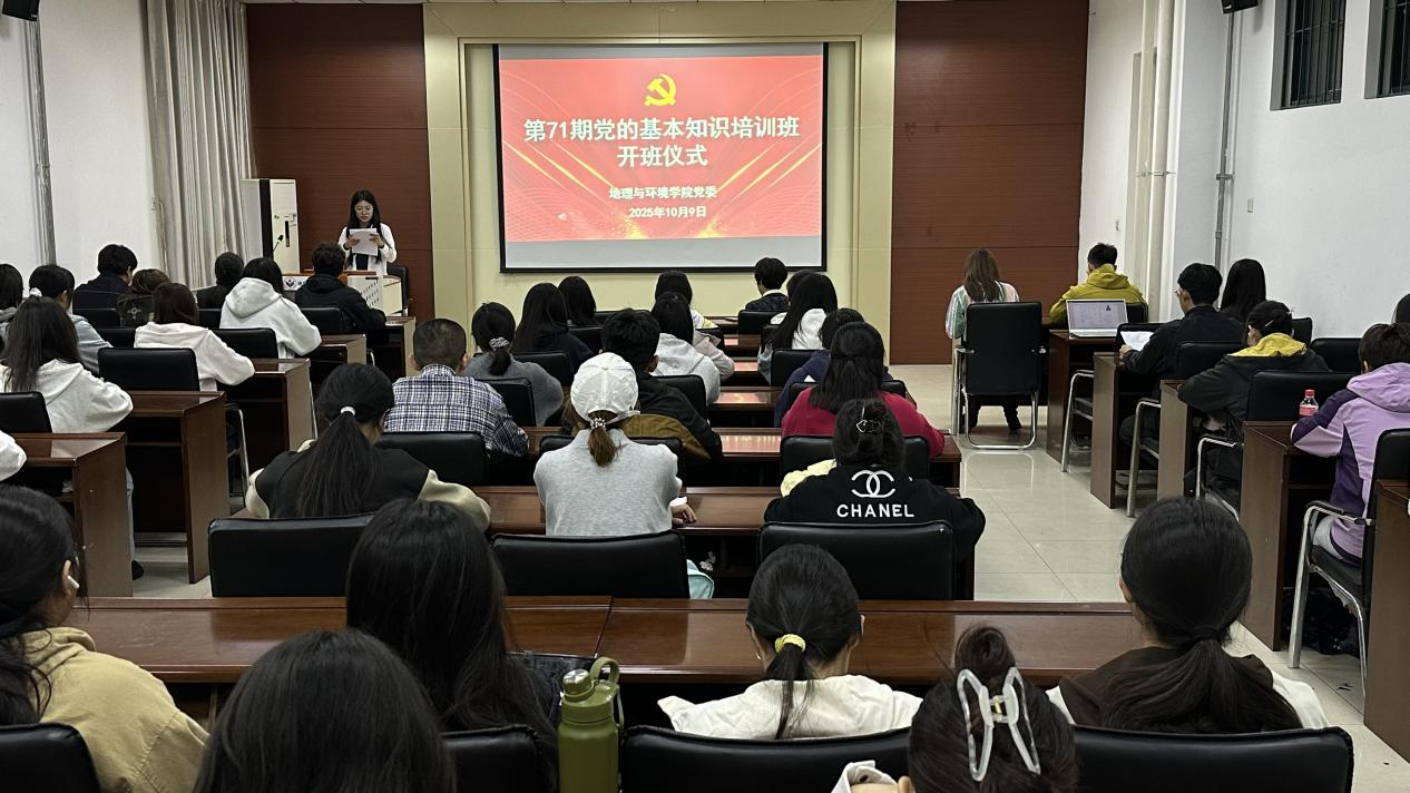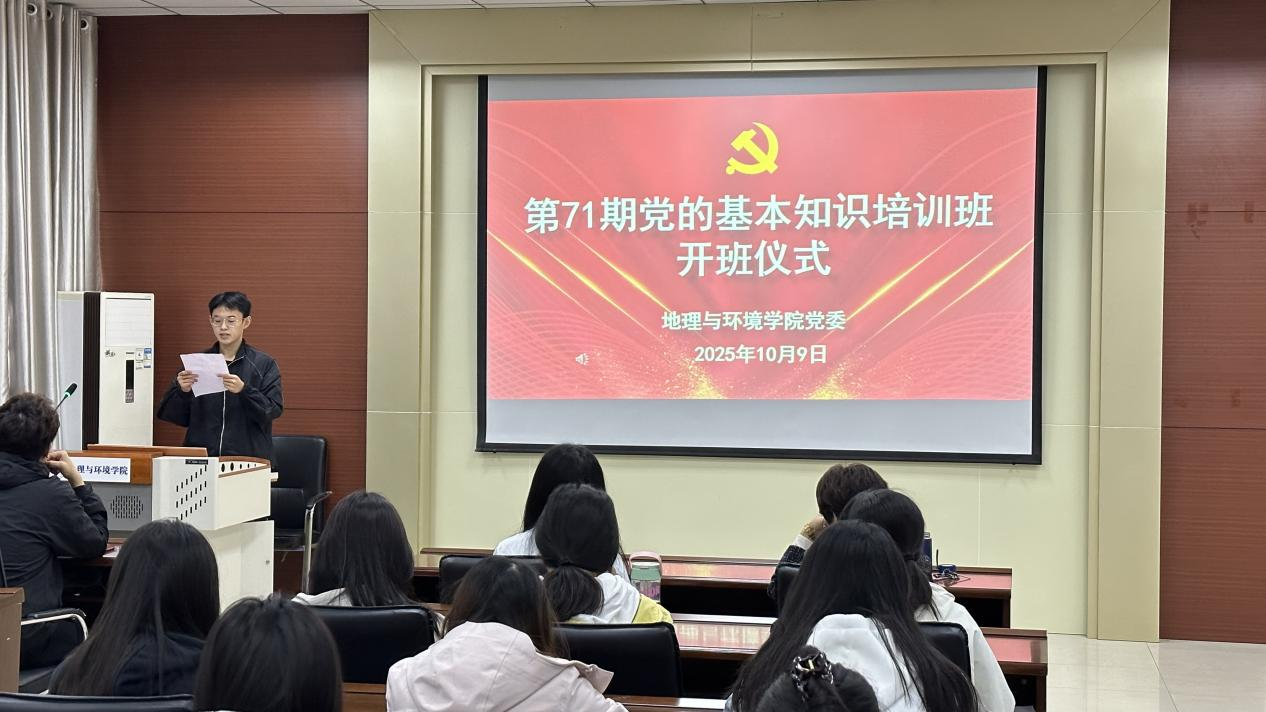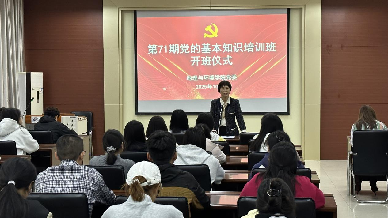 为深入学习贯彻习近平新时代中国特色社会主义思想和党的二十大精神,切实加强对入党积极分子的思想政治引领,夯实其党的理论基础,筑牢理想信念根基,10月9日,地理与环境学院党委举办第71期党的基本知识培训班开班仪式,学院党委书记刘永慧出席活动并讲话。活动由学院组织员、党基班班主任袁安宁主持,学院学生党支部书记、辅导员代表及本期培训班全体学员参加。