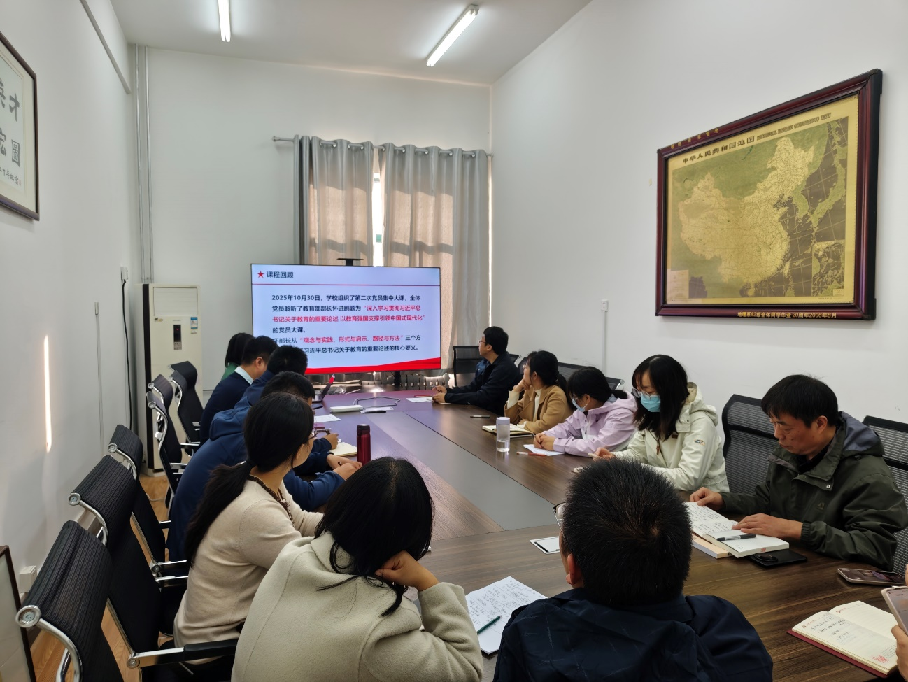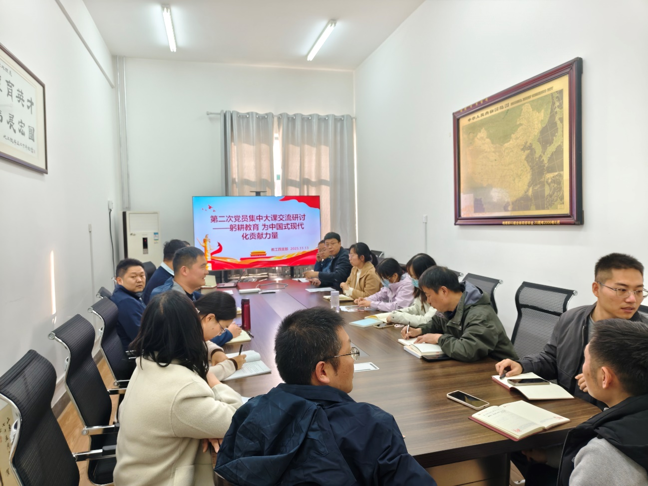 11月13日下午,地理与环境学院教工第四党支部在文澜楼G317会议室召开第二次党员集中大课交流研讨会,围绕教育部党组书记、部长怀进鹏主讲的“深入学习贯彻习近平总书记关于教育的重要论述 以教育强国支撑引领中国式现代化”辅导报告展开交流研讨,党支部书记吕建树主持研讨,党支部全体党员参加。