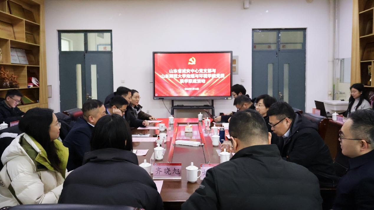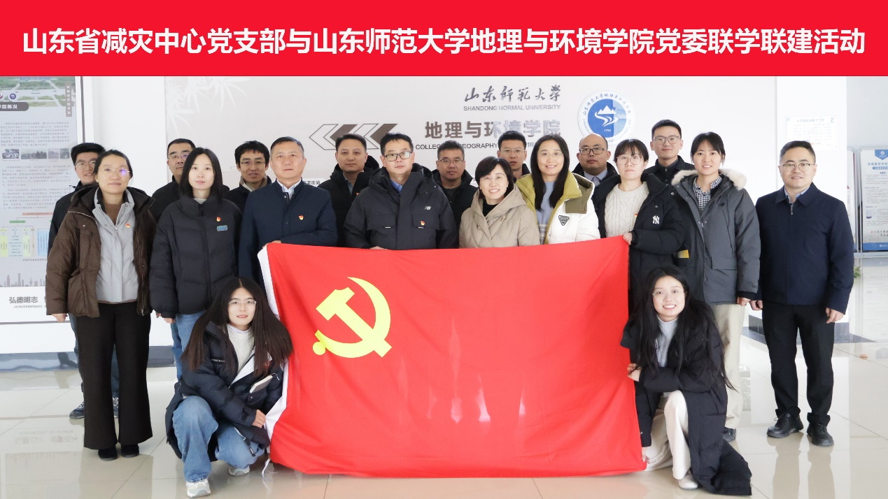 2026年1月16日,山东省减灾中心党支部书记、主任李冰一行来到山东师范大学地理与环境学院,与学院党委开展了以“党建引领聚合力,校地共建促发展”为主题的联学联建活动。地理与环境学院党委书记刘永慧,副院长宗万松、张宝雷、程钰,以及部分专业教师代表参加了此次活动。