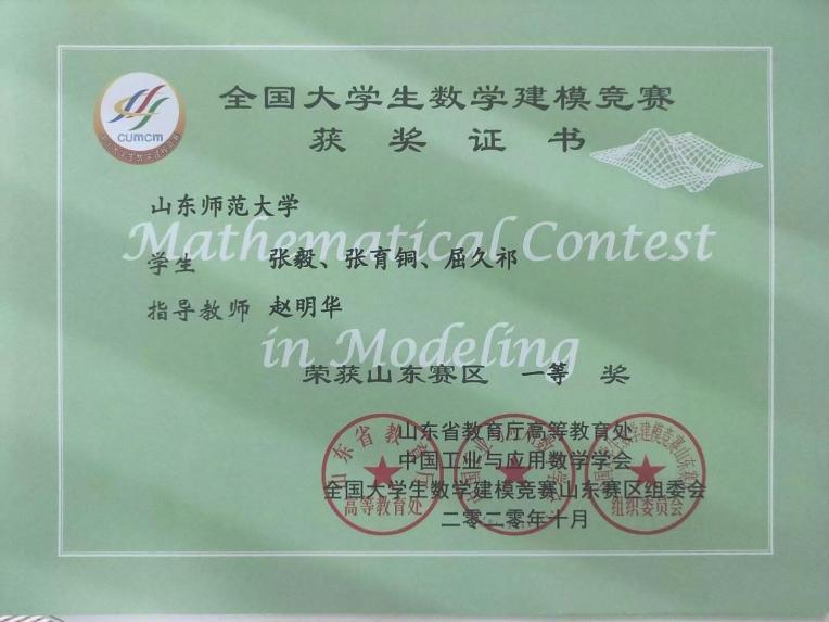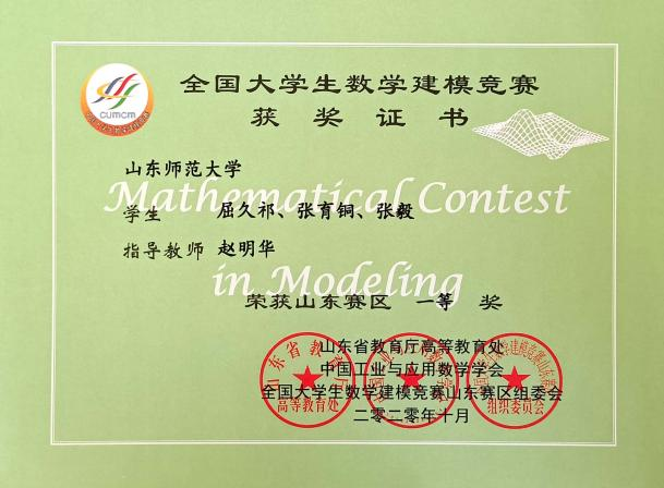 2018级地理科学专业本科生,曾荣获“优秀学生”、“优秀共青团员”、“图书馆优秀志愿者”等荣誉称号;多次获得优秀学生三等奖学金、优秀学生单项奖学金和环保知识竞赛优秀奖;全国大学生数学建模大赛山东省一等奖;亚太地区数学建模竞赛(APMCM)一等奖;现考研至山东师范大学。